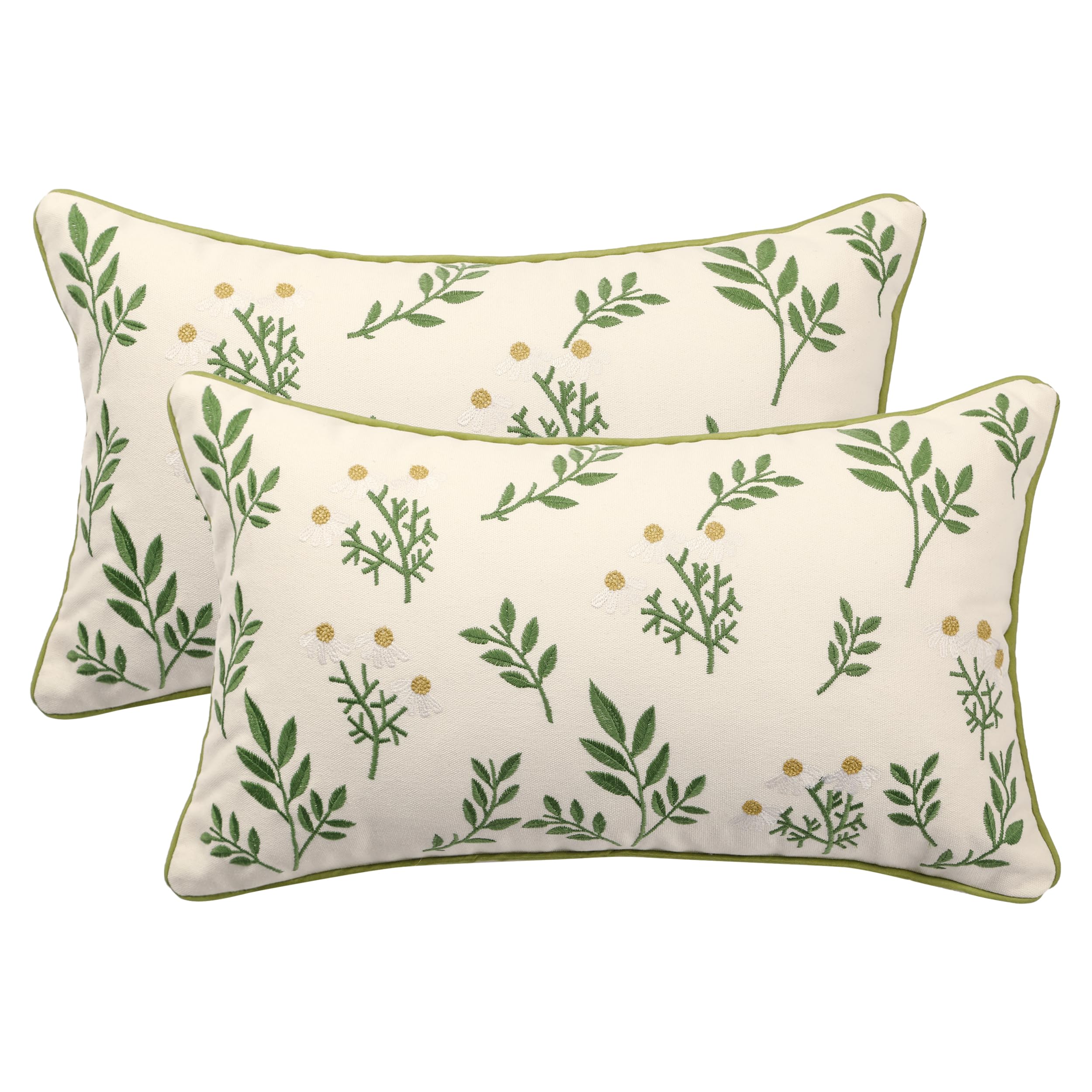 Tosleo Embroidered Throw Pillow Covers 12x20 inch Pack of 2 Green Little Daisy Decorative Pillowcases Farmhouse Cotton Pillow Cushion Cases Home Decor Square Floral Pillow Case
