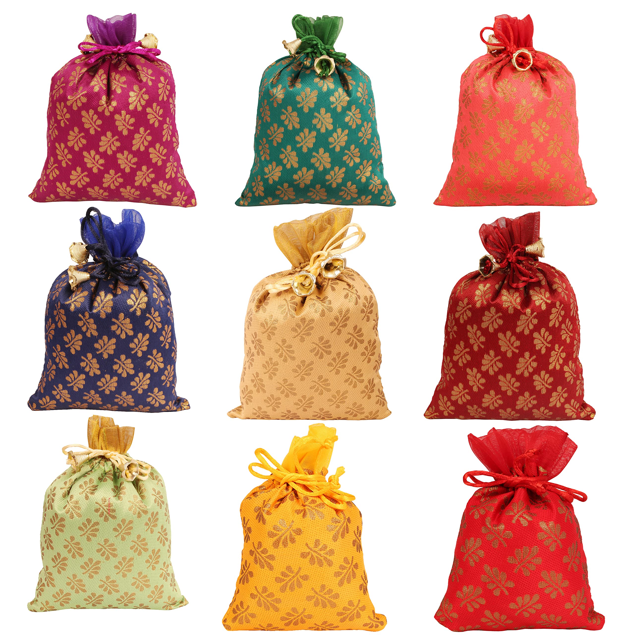 Touchstone Drawstring Bags Traditional Indian Handcrafted in Mimosa leaf Pattern Brocade fabric. Perfect for Gifts Jewelry Weddings Sweet Distribution Set of 9 Vibrant Multicolor Pouches Purses Potli