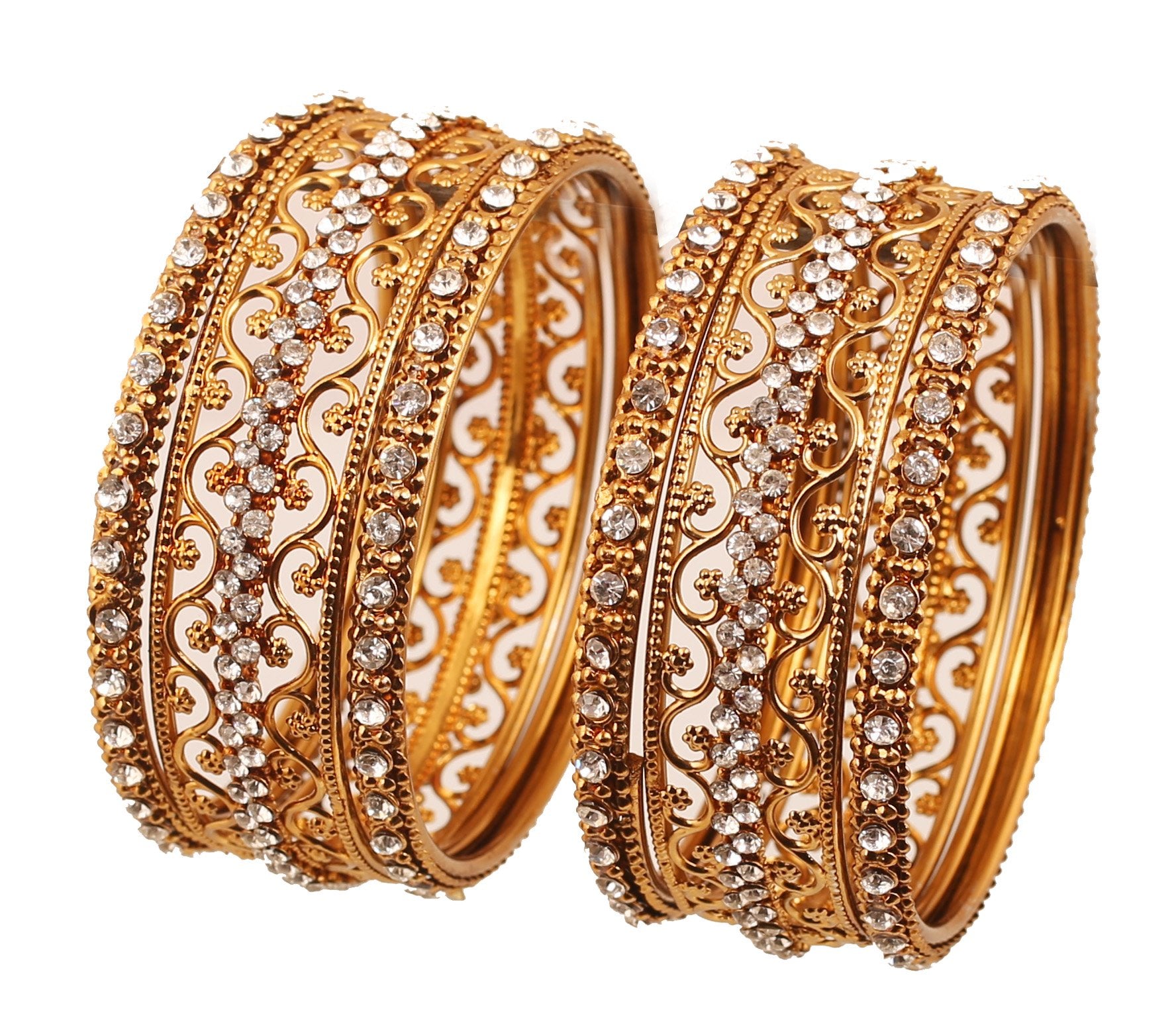 Alloy metal, filigree and grain work traditional Indian style clear rhinestone thick and thin bangle bracelets. set in antique gold tone. Set of 6.