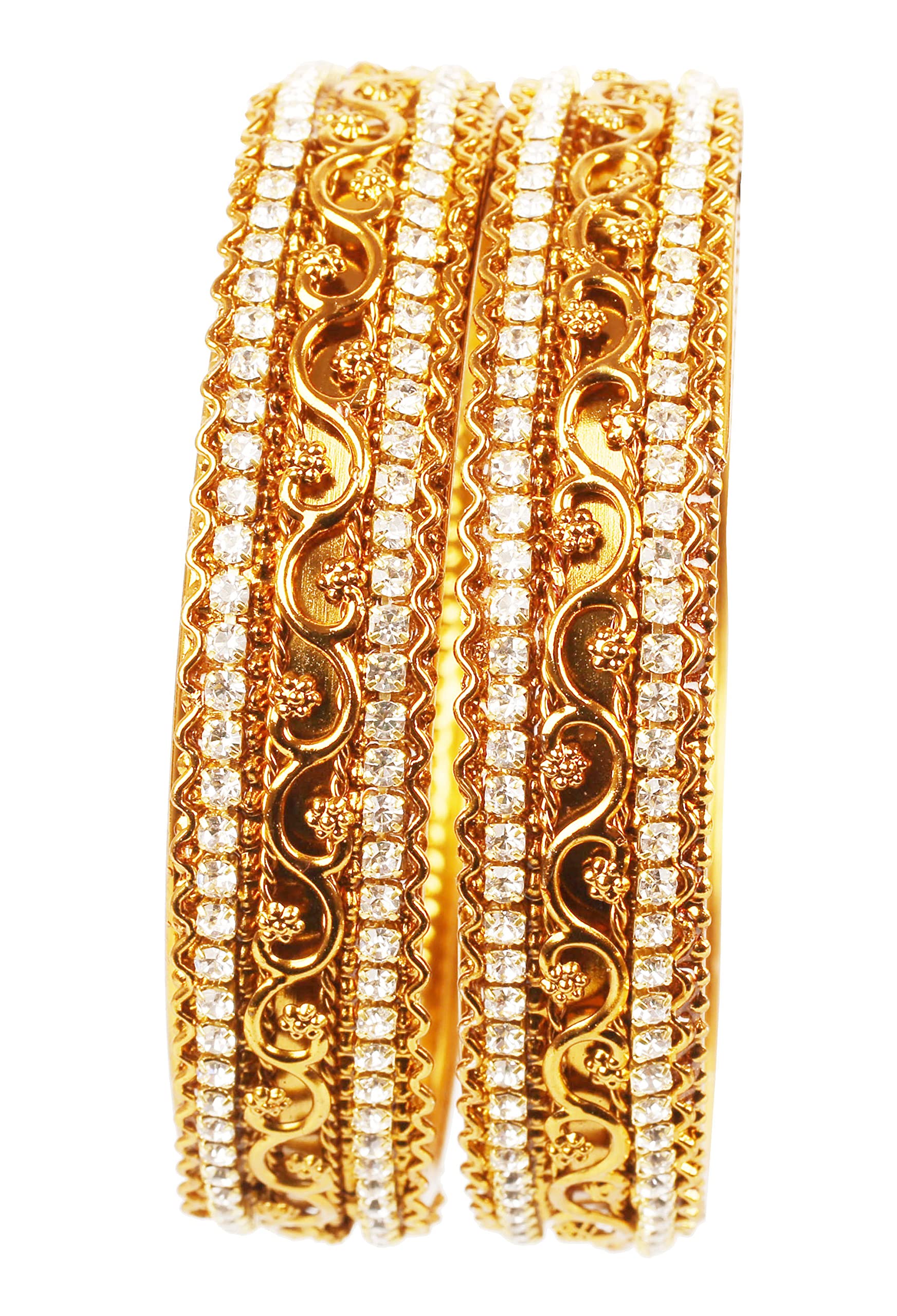Alloy metal, exotic rhinestone zigzag wire designer thick kada bangle bracelets. Set of 2. In antique gold tone.