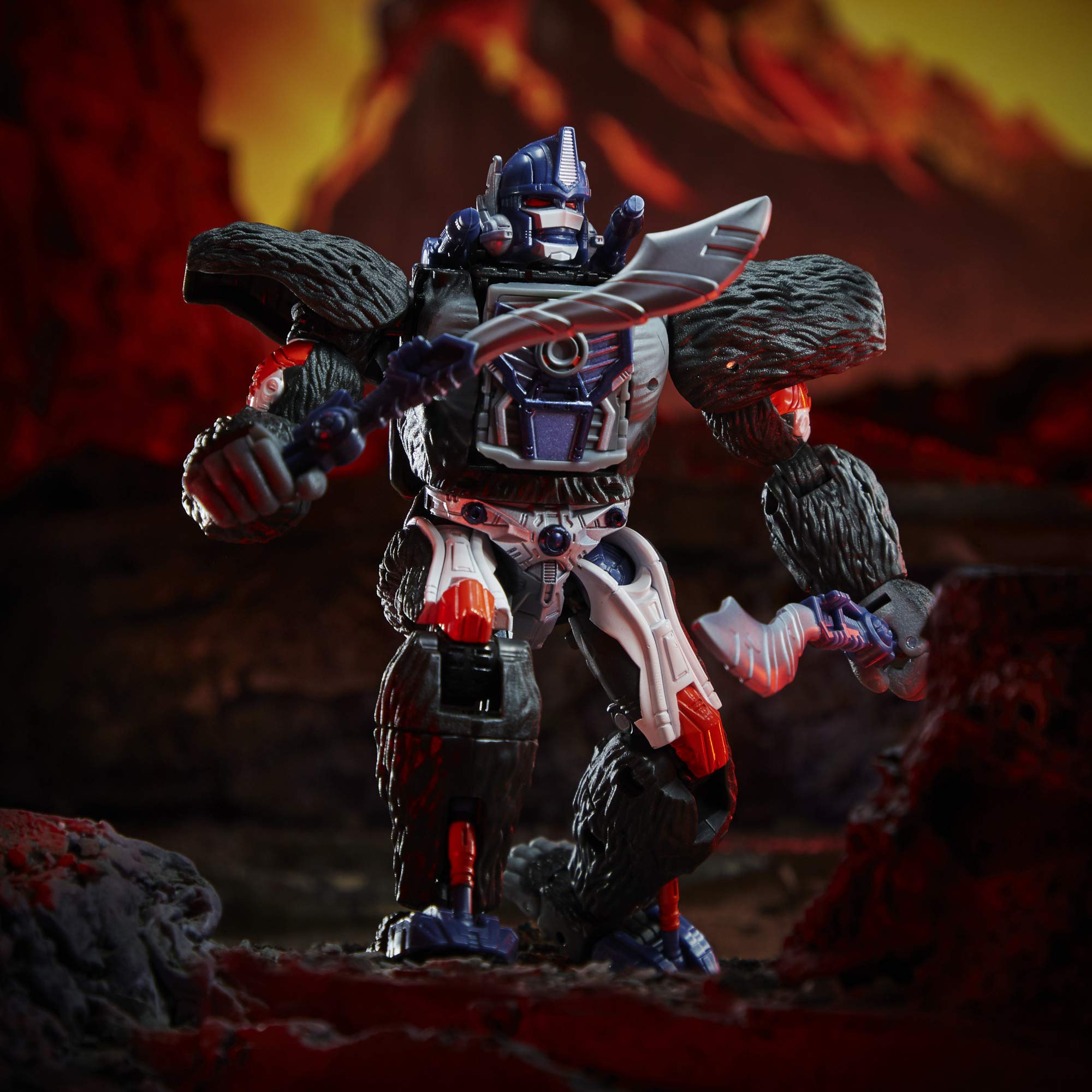 Beastify the battlefield! Worlds collide when the Maximals and Predacons join the fight, coming together with the Autobots and Decepticons in an epic battle that will alter their destiny forever. Primal power floods the battlefield as the fierce beast modes of the Maximals and Predacons are unleashed!Unleash the primal power of the beasts with this Optimus Primal collectible figure, featuring a detailed beast mode with intricate molded gorilla fur. Toy converts to Beast Wars-inspired gorilla mode in 22 steps and features hip articulation that allows fans to pose him upright or in a crouch. Comes with the character's classic 2 Cyber Blade accessories that attach to figure's back. Also features hidden forearm cannons and Mega Blasters. Well, that's just prime!Includes a Golden Disk card that reveals a possible destiny of a key character. C Collect other Kingdom figures to reveal all 3 alternate destiny variants for each character! (Each sold separately. Subject to availability.)