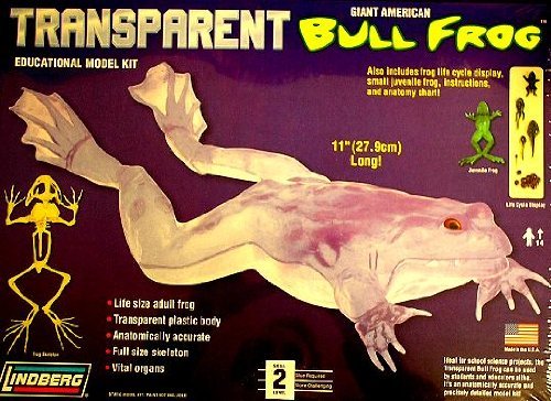 Transparent Giant American Bullfrog Educational Model Kit. 2009, J. Lloyd Intl., Cedar Rapids. Item no. 76012. Instructions in English and French. Model kit (paint NOT included). Skill level 2 - based upon a scale from 1 (least difficult) to 3 (most difficult). Box contains 42 total pieces. What we have here is a life-sized adult frog replica inside a transparent plastic body. We have a full-sized skeleton with a frog life-cycle display, a small juvenile frog. Instructions and anatomy chart. We have a frog skeleton and a list of vital organs. "Anatomically accurate and precisely detailed model kit." Illustrated box measures 15 3/4" x 11.5" x 3". Your life-sized adult frog measures 11". This would be a lot of fun for a family / students / educators alike. Most interesting.