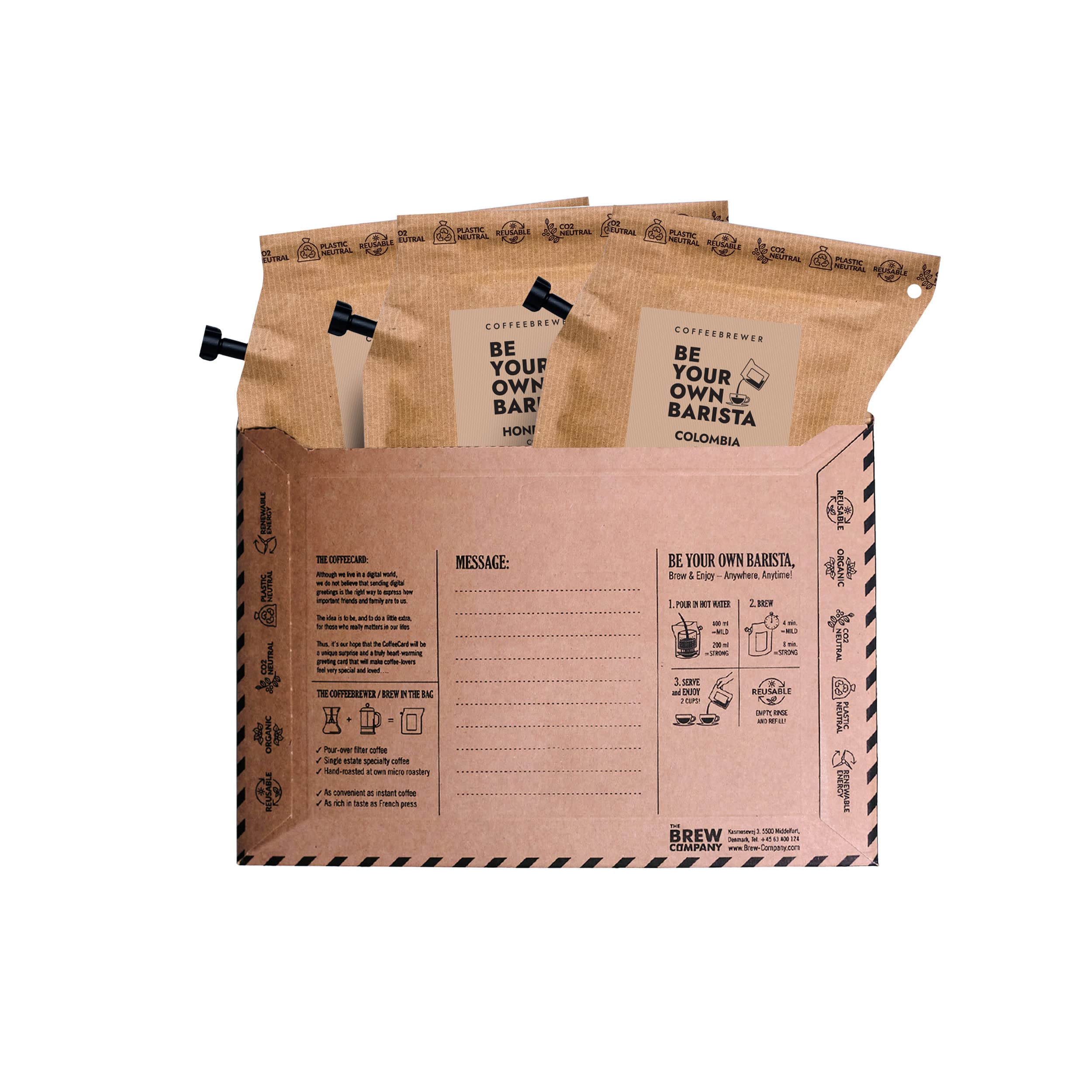 This Coffee Travel Pack is made as an addition to your travel mug - no matter where it takes you. Our Coffeebrewer brew bags contain 20-22g of Single Estate Specialty coffee that allow you to enjoy 2 cups of coffee on a single brew. In this pack you will get three of these bags in a convenient and light-weight envelope that makes this set ideal for any travel, outdoor or your on the go lifestyle. Each of our Coffeebrewer bags can be reused multiple times. Just empty out the used coffee grounds, refill and grab hot water & your favourite outdoor mug. We take care of the environment. Therefore, all our products are CO2 neutral, plastic neutral, reusable and traded ethically. The patented filter design inside the bag combines the sophisticated brewing techniques known from a French Press and pour-over filter with the convenience of instant coffee. The result is an outstanding brew in highest quality with minimum hassle. No machines needed, just add hot water and pour in your mug. With our coffees you get full traceability with every bean. We are in close contact with the farms where our coffees stem from. We want to raise awareness and appreciation for the work of the farmers - that is also why we never do blends.