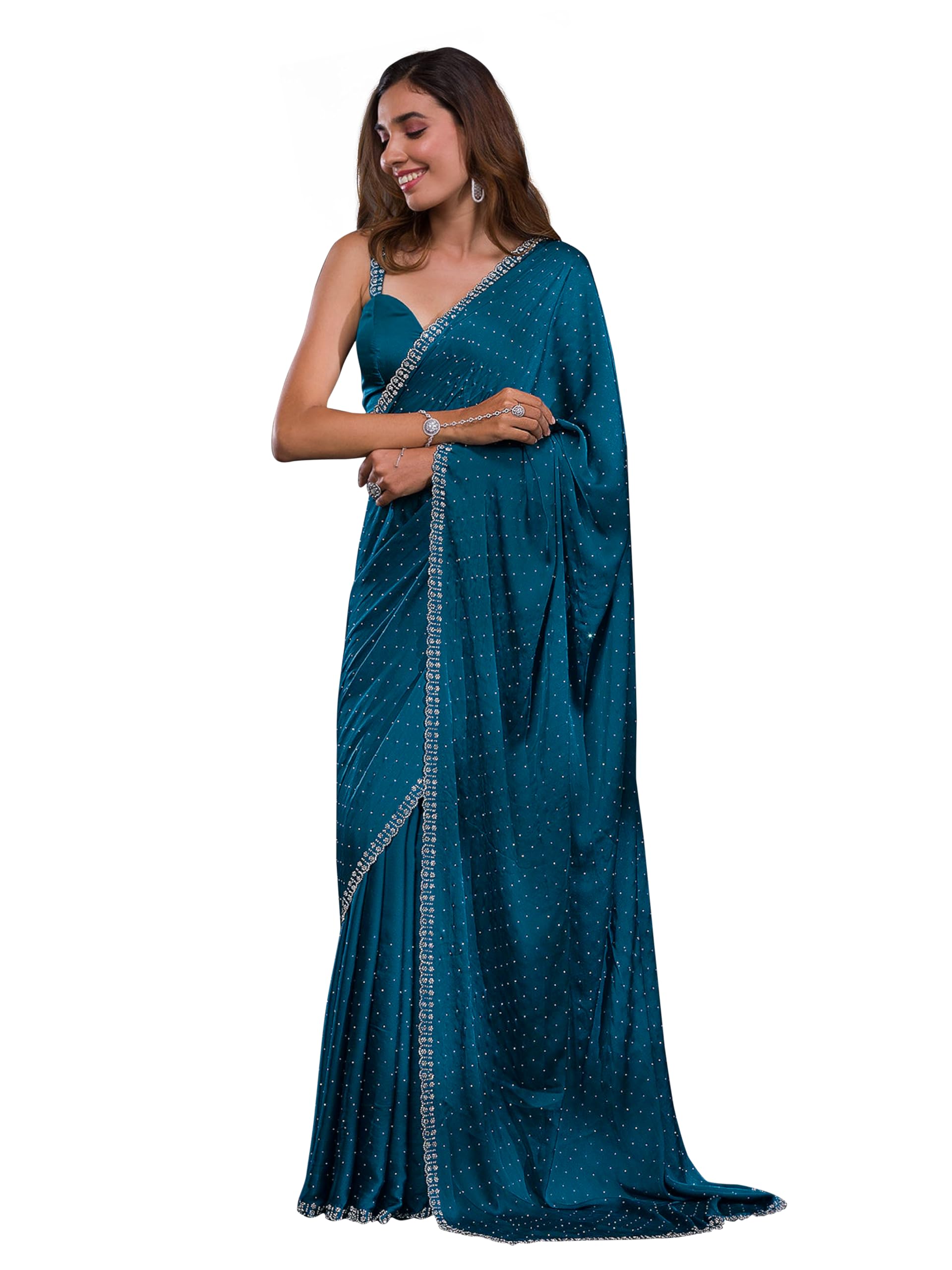 TRENDMALLS Women's Satin Georgette Siroski work Saree with Unstitch Blouse Piece (K1086-Morpeach)