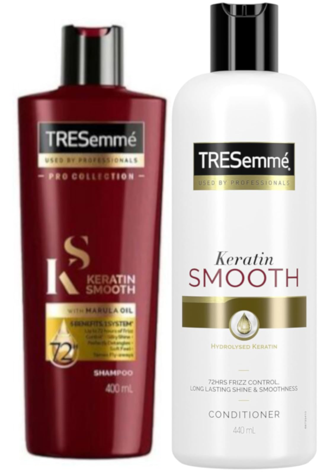 DescriptionProduct DescriptionTRESemmà Keratin Smooth, with Keratin and Marula oil from Africa, gives you up to 72 hours of frizz control* and 5 smoothing benefits in 1 system** - Keratin Smooth shampoo and conditioner - for hair thats silky smooth but still full of natural movement. Anti frizz, visible hair repair, detangles knots, boosts shine, adds softness and tames flyaways. Features TRESemmà Keratin Smooth hair shampoo helps to control frizzy hair without leaving hair looking dull TRESemmà Keratin Smooth System helps you to achieve silky smooth hair that's still full of natural movement System of Keratin Smooth Shampoo and Conditioner Formulated with Keratin and Marula oil; you can enjoy up to 72 hours of frizz control System of Keratin Smooth Shampoo and Conditioner vs non conditioning shampoo Frizz control shampoo, detangle knots, boost shine, add softness and tame flyaways Enjoy a smooth look and feel that moves as you do Follow up with TRESemmà Keratin Smooth Conditioner to smooth every strand Product Specification Size (400) Unit (ML) Height (21.8) Width (4.8) Depth (7.6) Product Uses Beautifully smooth hair starts with gentle cleansing. Apply a generous dose of TRESemmà Keratin Shampoo to wet hair. Gently massage the scalp and roots with fingertips to work into a lather. Once youve worked up a good lather, rinse well and follow up with the Keratin Smooth Conditioner to fight frizz and smooth every strand."DirectionsApply a generous dose of TRESemmé Keratin Smooth Shampoo to wet hair. Gently massage the scalp and roots with fingertips to work into a lather. Once you’ve worked up a good lather, rinse well and follow up with the Keratin Smooth Conditioner to fight frizz and smooth every strand.