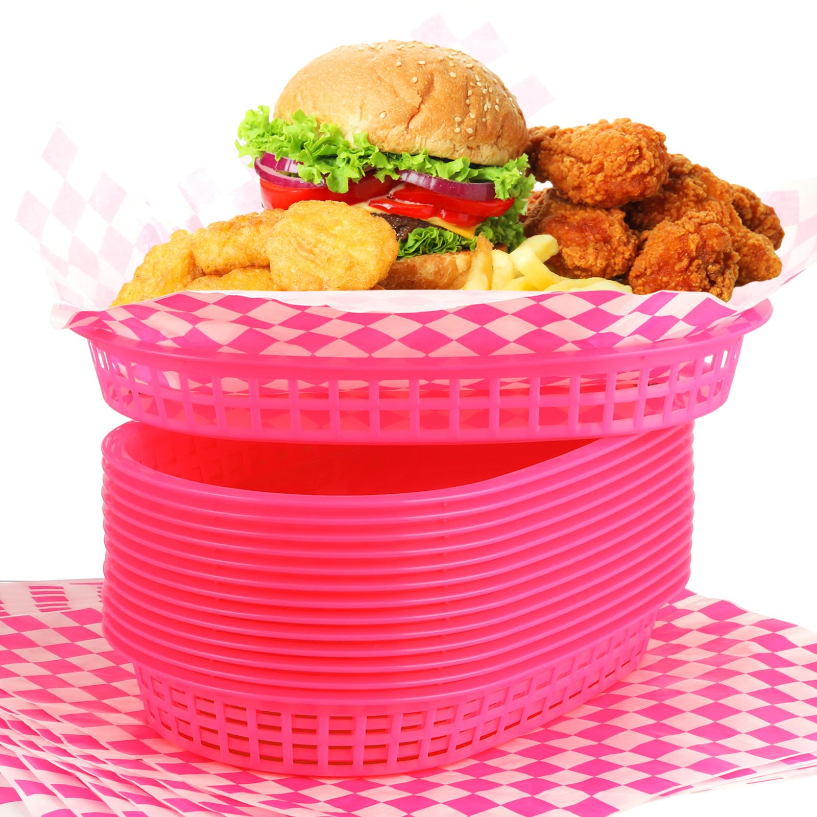 Uiifan 24 Pcs Fast Food Baskets with 100 Deli Liners Deli Baskets Food Baskets 10.5 x 7 Inch for Serving Burger Baskets Chip Baskets Service Basket Trays for Hot Dog Hamburger Bread Picnic (Hot Pink)