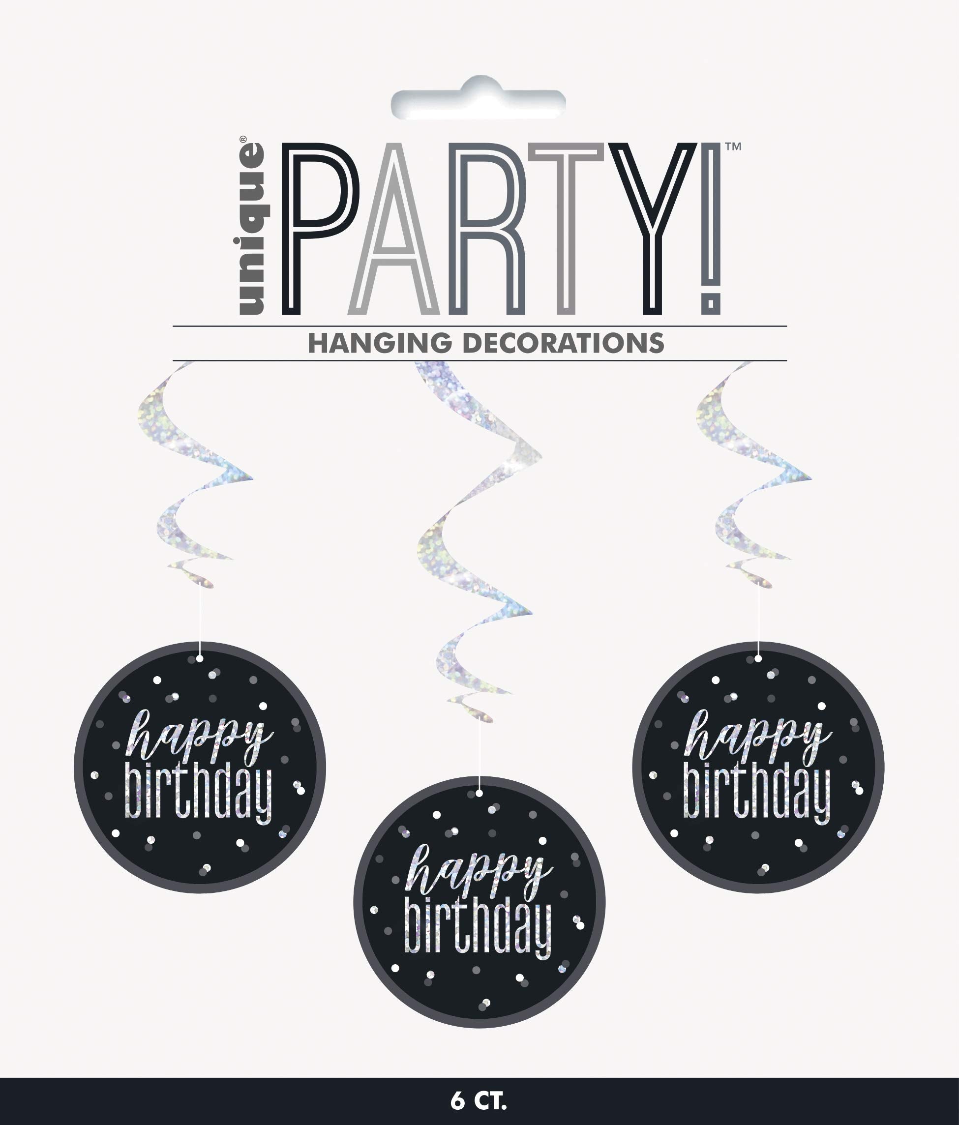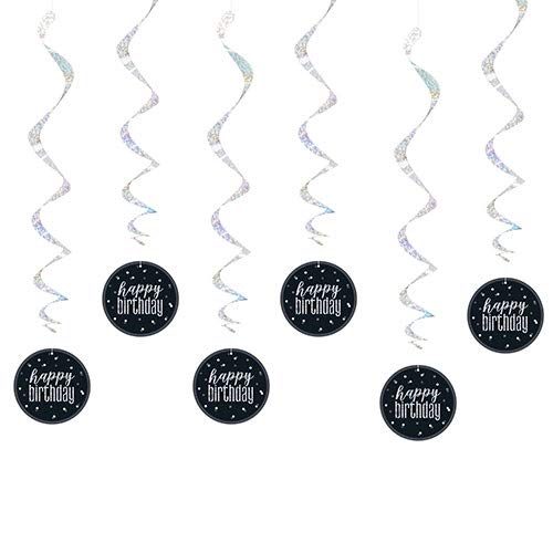Add a shimmering decoration to your party room with these swirls. These hanging decorations feature prismatic swirls attached with round board stock with prismatic "Happy birthday" text surrounded by silver and gray dots in black background. These hanging swirls will definitely make a perfect decoration for birthday party room.