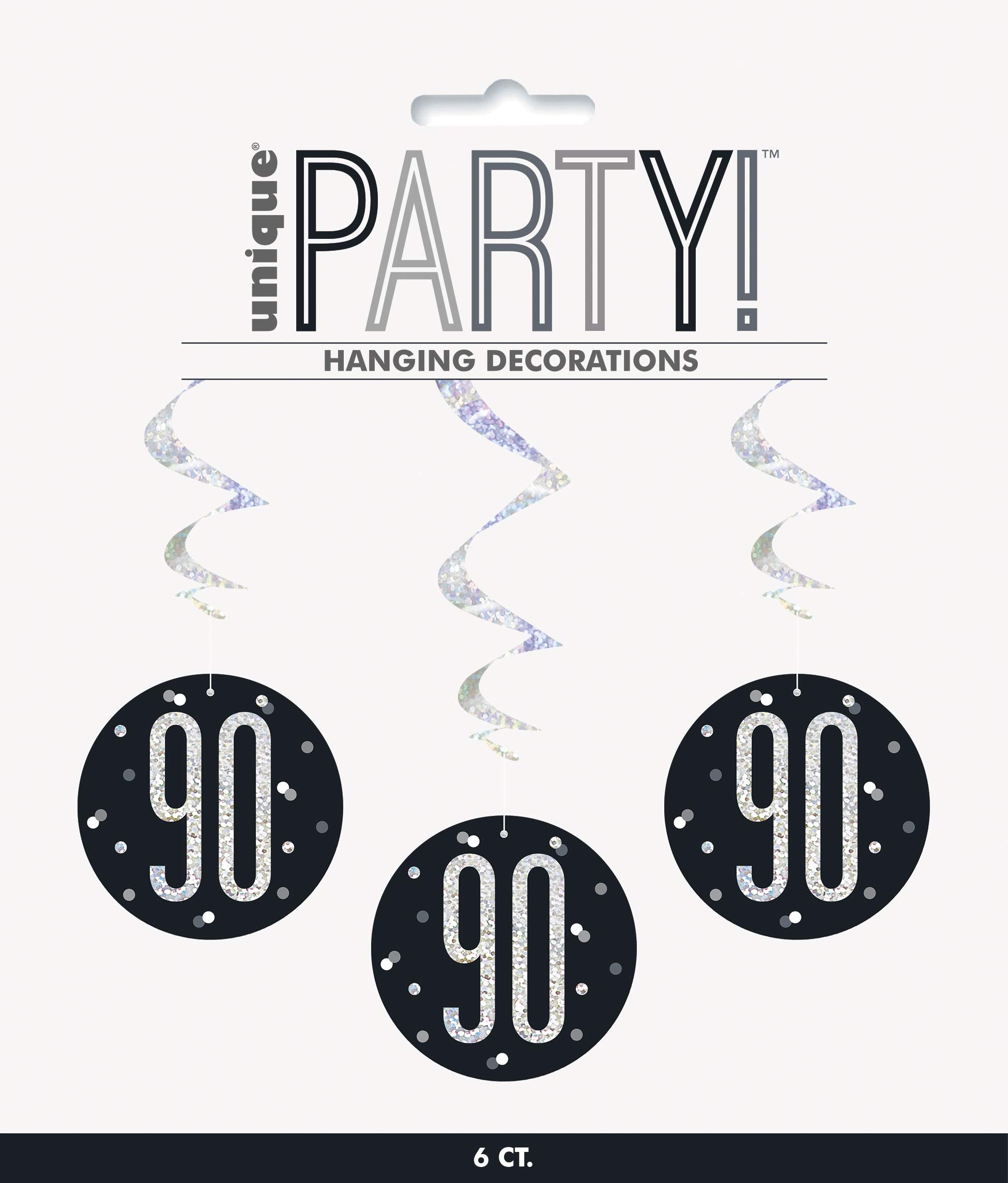 Add a shimmering decoration to your party room with these swirls. These hanging decorations feature prismatic swirls attached with round board stock with prismatic number "90" text surrounded by silver and gray dots in black background. These hanging swirls will definitely make a perfect decoration for birthday party room.