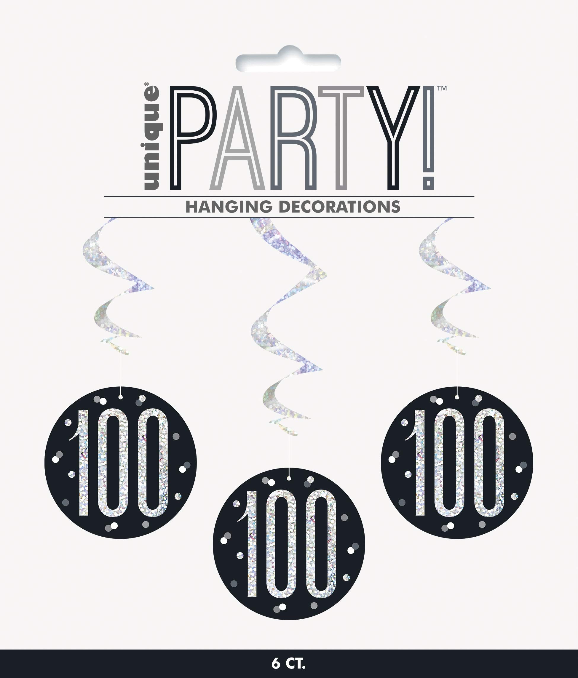Add a shimmering decoration to your party room with these swirls. These hanging decorations feature prismatic swirls attached with round board stock with prismatic number "100" text surrounded by silver and gray dots in black background. These hanging swirls will definitely make a perfect decoration for birthday party room.