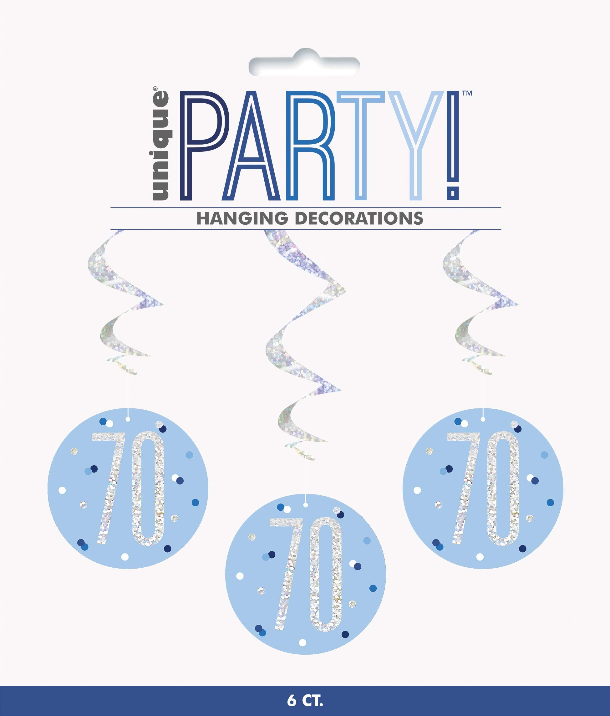 Add a shimmering decoration to your party room with these swirls. These hanging decorations feature prismatic swirls attached with round board stock with prismatic number "70" text surrounded by silver and blue dots in blue background. These hanging swirls will definitely make a perfect decoration for birthday party room.
