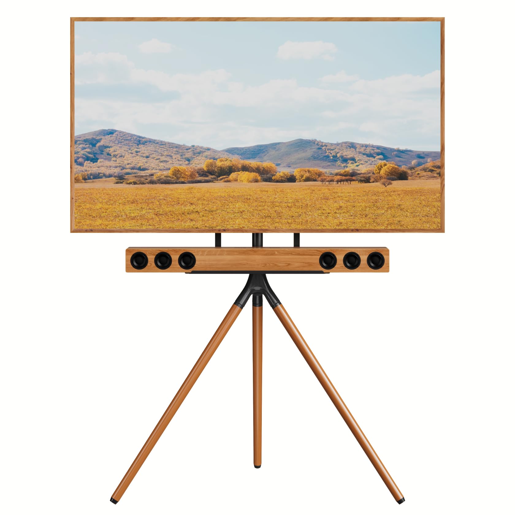 Boasting a stylish, chic artsy look, this eye-catching minimalistic tripod TV stand is phenomenal for any Mid-Century Modern design aesthetics and provides fantastic visibility in multiple areas. It is a perfect alternative if you don’t want to mount your TV on the wall or place a TV cabinet taking up all your space or line of sight, either. The solid real wood legs with matte finish and the sturdy tripod forms a stable and strong base for holding your TV screen. The VESA 600x400mm compatibility ensures that it can accommodate a wide range of TV models in size from 45 to 65 inch with a maximum load capacity of 77 pounds. UPGRAVITY easel TV stand is height adjustable, allowing you to customize the viewing angle to your preference. The 180° swivel feature adds to the convenience, enabling you to adjust the screen direction as needed, which is particularly useful in larger rooms or open-concept spaces where viewing angles may vary. The middle metal shelf is perfect for a media device such as sound bar, gaming console, DVD player and streaming box. Conceal the power and AV cables discreetly by binding them along the rear leg of the TV tripod with the included cable ties. This creates a cleaner and more pleasant look while keeping the surrounding area safe from accidents. Non slip furniture pads are embedded at the end of each leg to ensure your hardwood and tile floors are protected from scratches. If you have children or big pets that may bump into the legs, you have choice to use anti-tip kit for anchoring the TV easel securely to the wall for extra security.
