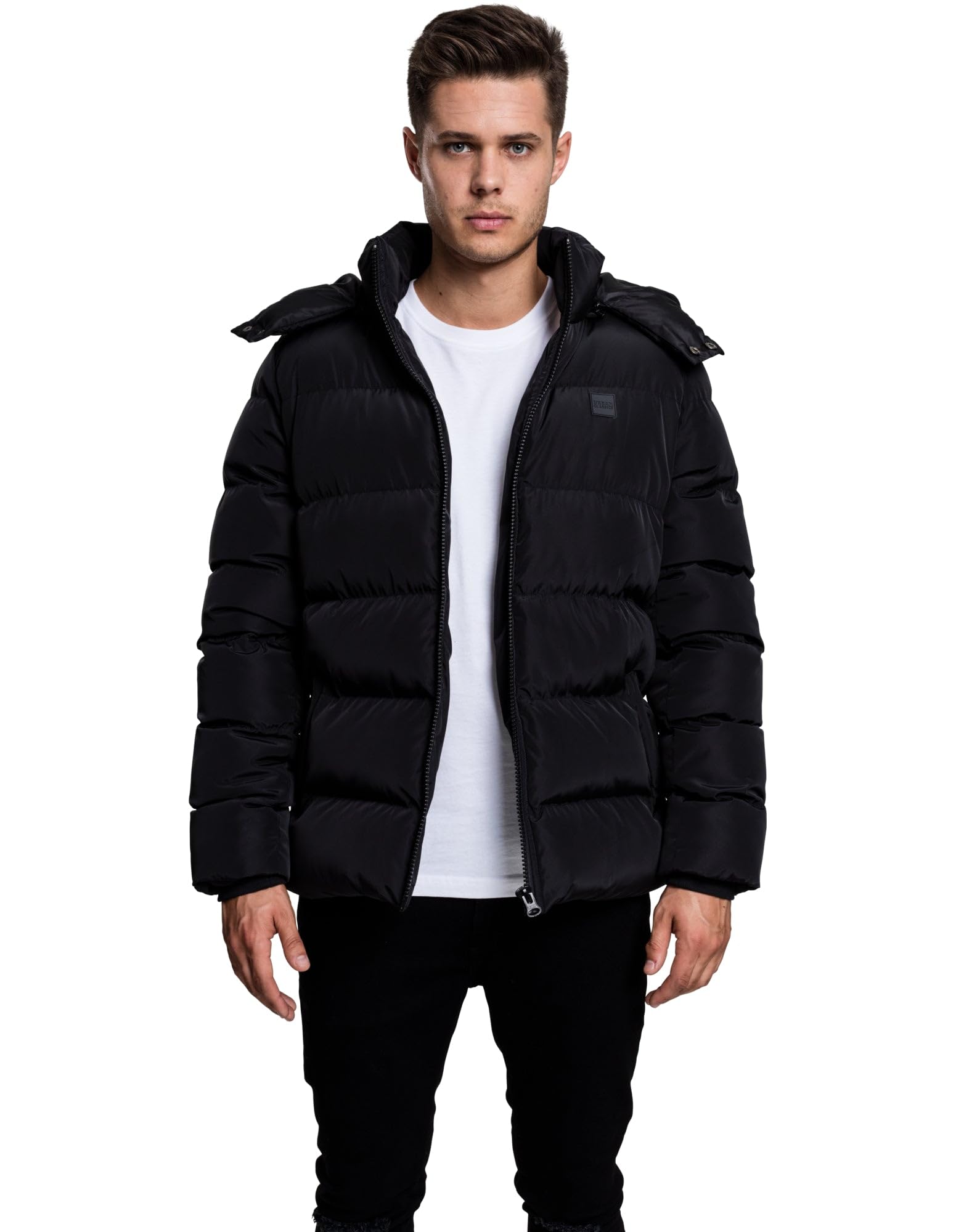 DescriptionURBAN CLASSICS Men's Hooded Puffer Jacket. Tackle the winter temperatures in style with this comfy and warm winter jacket! Urban Classics's Puffer Jacket is a must-have addition to any man's winter wardrobe: thanks to its padded quilted interior and the 100% polyester, you can make sure that you will never suffer the cold. Made in the style of a down jacket, this comfortable winter jacket is lined with fake down and has fitted elasticated cuffs, which prevent the cold from entering your sleeves. Forgot your scarf? The high neck provides you with warmth around your neck and can be closed through a button. The showerproof jacket features 2 front pockets and one interior pocket to keep your accessories safe and sound. The highlight of this jacket is the removable padded hoodie: zip it away when the weather gets warmer and put it back when it starts to rain, no problem at all! The polished outer fabric makes the jacket an absolute winterwear staple, for a trendy style even during cold seasons! The product has the following characteristics: Material: Lining 1: 100% polyester, 230T, 70 GSM outer, Fabric 1: 100% polyester, 75D mat, 139 GSM, Padding: 100% polyester, bubble padding | Fitting: comfortable cut | Sizes available: S-5XL | Colours available: black, blue navy, green olive, rustorange | Fastening: zipper | Removable Drawstring Hoodie | 2 front pockets, 1 inner pocket | Washing instructions: 30° delicates wash (do not tumble dry, do not bleach, iron at low temperatures) | In 2005 URBAN CLASSICS saw the light of day in the streetwear world and from that moment until today, it embodies much more than just a brand logo. The variety of URBAN CLASSICS products is inexhaustible. The tees, hoodies, college jackets, sweatpants, shirts and tanks do without motif prints and elaborate logos. Simple, underlined with blocked colour accents, the inimitable urban cut line of the streetwear is revealed. URBAN CLASSICS focuses on a clean design. This is less about the label and more about the unique character - classic cuts that "never go out of style".