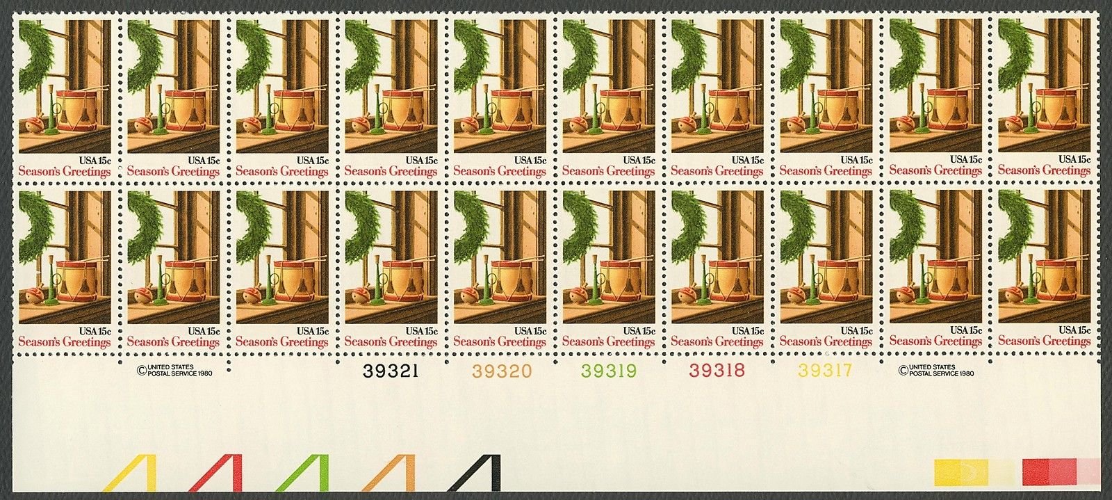 US 1980 Christmas Wreath Stamp Plate Block of 20 Stamps #1843