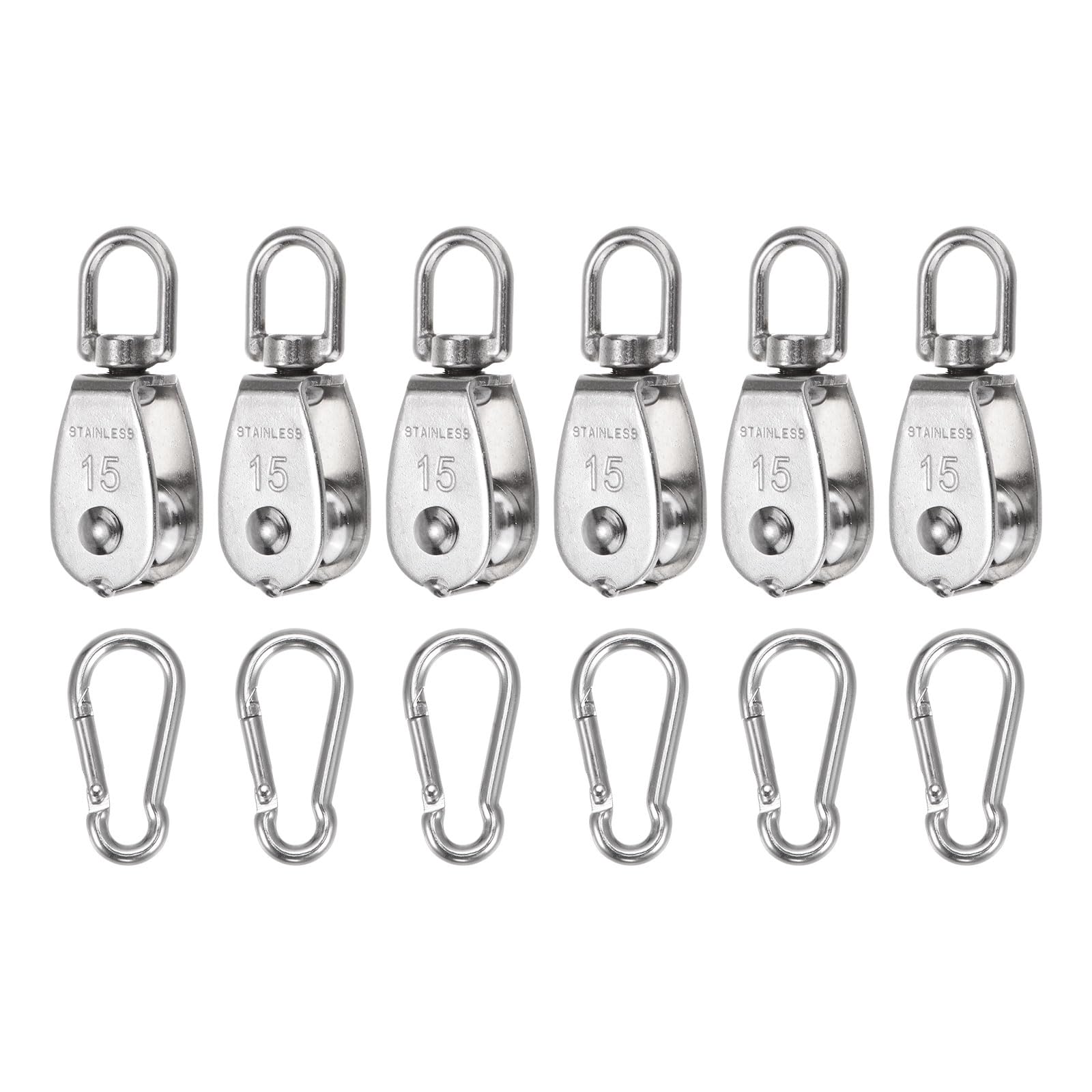 uxcell Set of 6 M15 Single Pulley Block with Spring Snap Hook, 304 Stainless Steel Hanging Wire Towing Wheel, Crane Pulley Roller Loading 80lbs