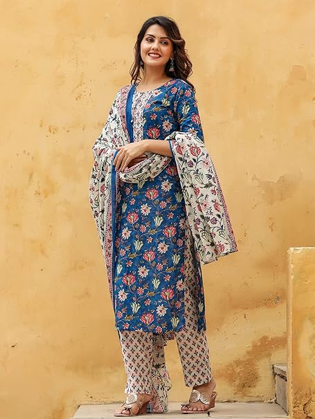 Vaamsi Women's Rayon Cotton Blend Floral Printed Straight Kurta Pant With Dupatta (VKSKD1238_Blue_XXL)