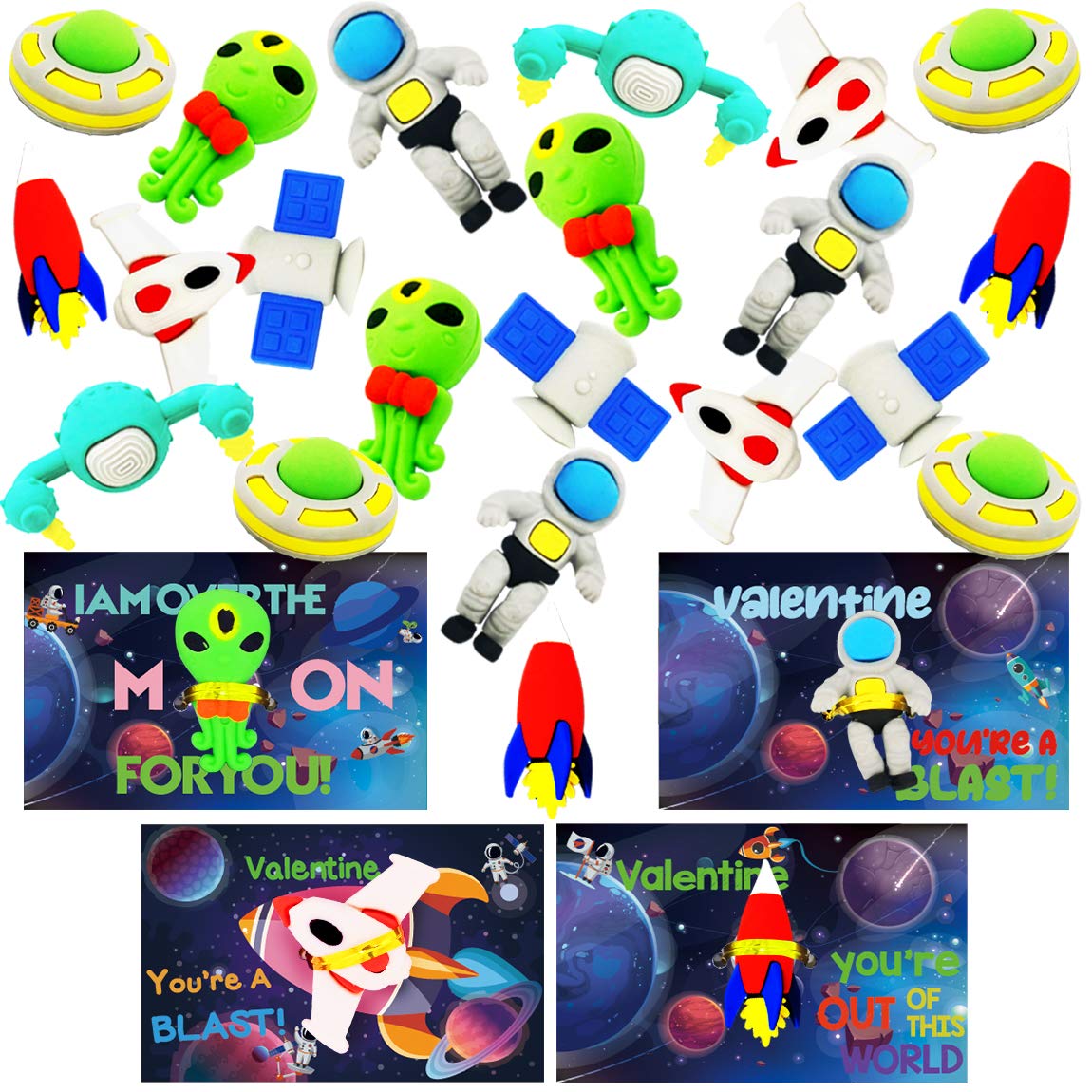 SUPER VALUE COMPREHENSIVE SET: This Package Includes 28 Valentine's Cards (4 Designs), 28 Piece Outer Space Puzzle Erasers (7 Designs), a Pack of Metallic Twist Ties. | UNIQUE DESIGN & EASY TO USE: Each Card Has a Special Punchline and Pattern Which Matches the Outer Space, and Every Puzzle Erasers Has a Vivid Assorted Colors. Use the Twist-ties to Attach One Puzzle Erasers on Each Valentine's Card, No Glue Required. Also Easy for You to Carry. | RELEASE KIDS MIND: Scratch kid's art on the cards' back and write down a wish or greeting. This exchanging valentines gift creates opportunity for social skill development, and can be a time to teach children to express gratitude to friends & family with written expressions. | RELEASE KIDS MIND: Scratch kid's art on the cards' back and write down a wish or greeting. This exchanging valentines gift creates opportunity for social skill development, and can be a time to teach children to express gratitude to friends & family with written expressions. | IDEAL GIFT: Valentine's Day Cards are Perfect for Kids Valentine's Day, Class Events, Gift Exchange, School Classroom Prize, Love Notes, Party Favor and so on.