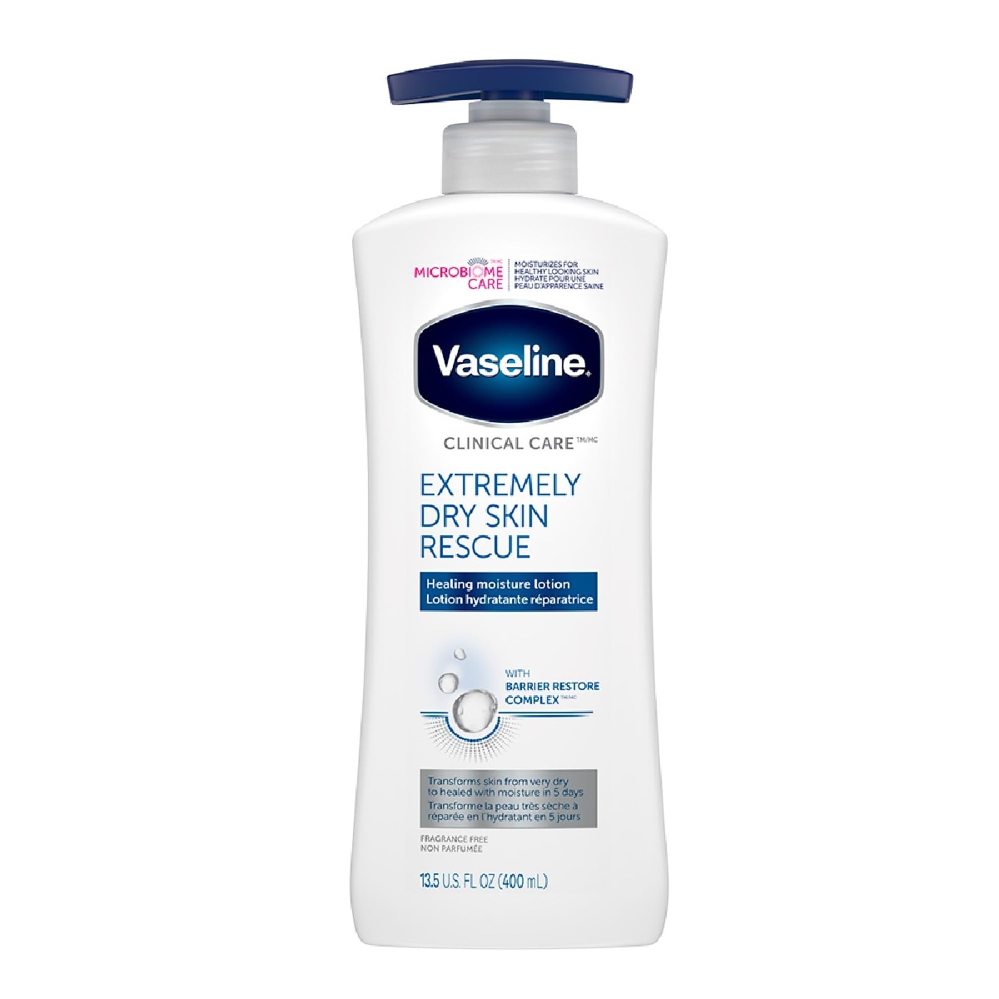 New Vaseline Clinical Care Extremely Dry Skin Rescue Body Lotion delivers clinical strength moisturization to transform skin from very dry to healed in just 5 days. This rich yet fast-absorbing moisturizer provides intense moisturization to help relieve dry skin. Suitable for Extra Dry Skin Vaseline Extremely Dry Skin Rescue Lotion isn’t just your average dry skin lotion. The formula delivers prescription-strength moisturization to restore soft, healthy looking skin. Extremely Dry Skin Rescue Body Lotion is a dry skin lotion that can moisturize stubborn dry patches on your skin and help you achieve soft skin. Lotion for Dry Skin Extremely Dry Skin Rescue body moisturizer helps to relieve dry skin from the first application. Extremely dry skin needs extra help to restore moisture levels. This skin moisturizer works hard for your extremely dry skin to transform it from very dry to healed in just 5 days. Vaseline Clinical Care is formulated with unique Barrier Repair Complex. Our new Barrier Repair Complex combines three key ingredients that work together to strengthen skin’s barrier. Glycerin delivers moisture, Vaseline Jelly locks in moisture, and pro-lipids replenish the skin’s moisture barrier. With this combination of these deeply moisturizing ingredients, Vaseline Extremely Dry Skin Rescue works as an effective moisturizer that offers fast relief for dry, stressed skin, with the assurance that this unscented lotion is suitable for sensitive skin.