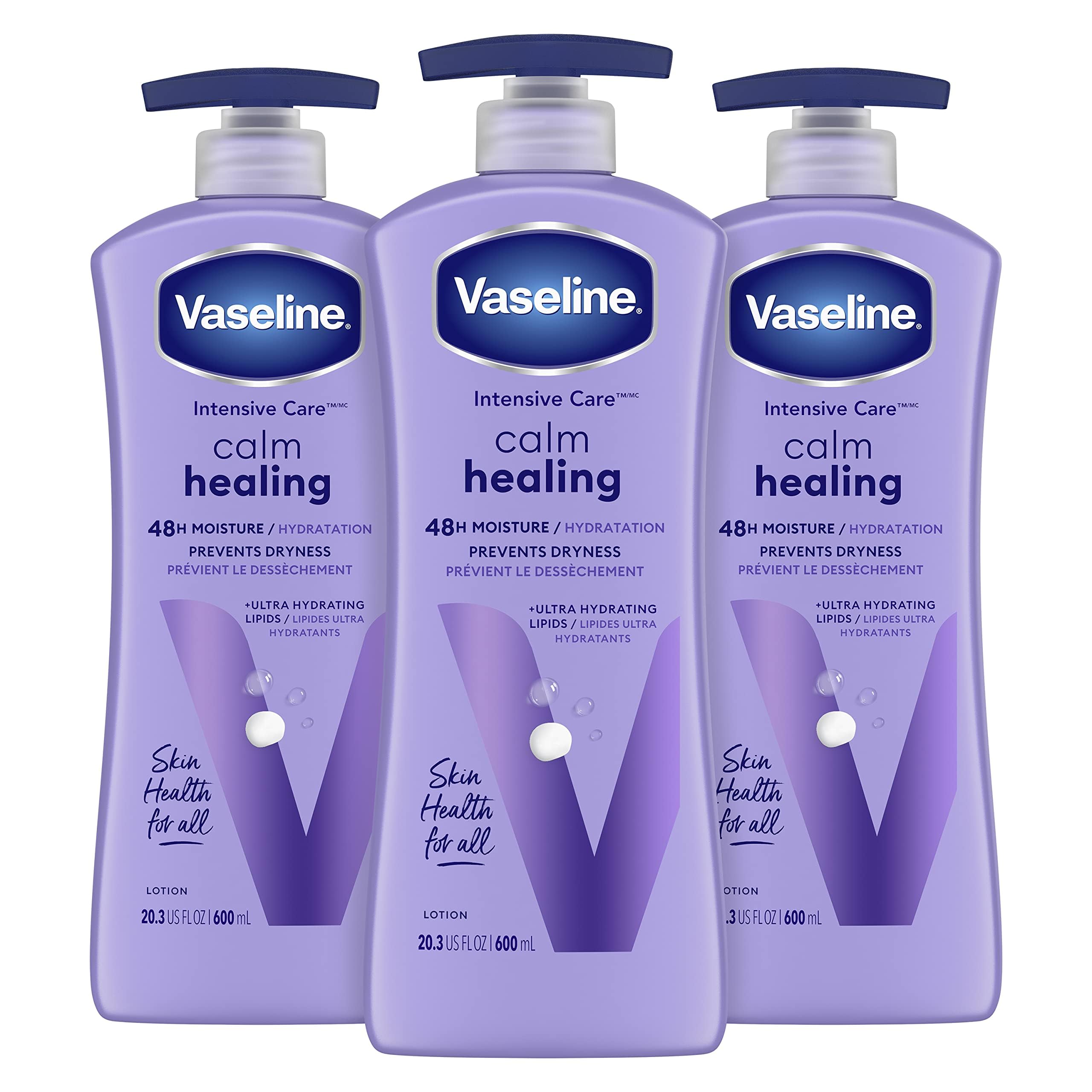 Vaseline Intensive Care Calm Healing Lotion calms, soothes and restores dry skin with a light lavender scent. This body lotion, formulated with Lavender Extract, helps keep your skin looking healthy and hydrated. With daily exposure to environmental triggers (like wind, lack of humidity, and sun), skin’s natural moisture barrier can break down, allowing water to escape the skin. The Ultra-Hydrating lipids in our lotion for dry skin fortify the skin barrier and replenish moisture to allow the skin’s natural barrier to recover. This lotion locks in moisture and promotes smooth, naturally glowing skin. The body moisturizer is clinically tested to provide 90% more moisture (vs. untreated skin). This body lotion for dry skin absorbs fast for rich moisturization and provides moisture all day long. Use this dermatologist-tested body lotion for dry skin daily on dry, rough skin for stronger, noticeably healthier skin. Just apply to your skin for hydrating relief. This Vaseline lotion bottle is made of 50% recycled plastic. Our ambition is to get to 100% recycled plastic in the near future. Since 2018, we've used 337 Metric Tons of recycled plastic across the Vaseline® product portfolio in North America. Our Intensive Care range works to heal dry skin from deep within. Explore the range of Vaseline products, including Vaseline lotion, and enjoy the healing power of Vaseline. Vaseline has a range of products to help soothe, and moisturize all skin. We believe skin health is essential for well-being. That’s why Vaseline is working towards giving everybody, everywhere, access to the skin care they need.