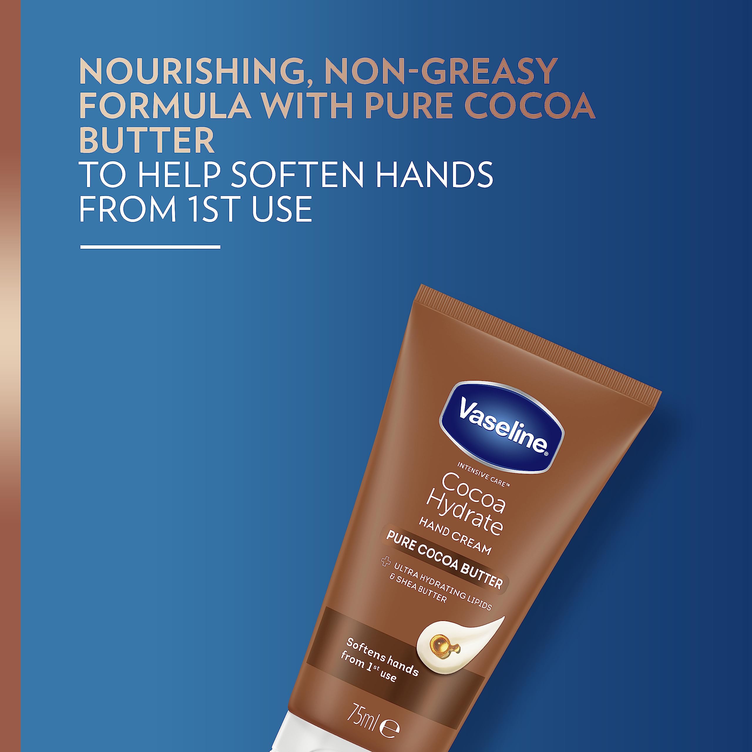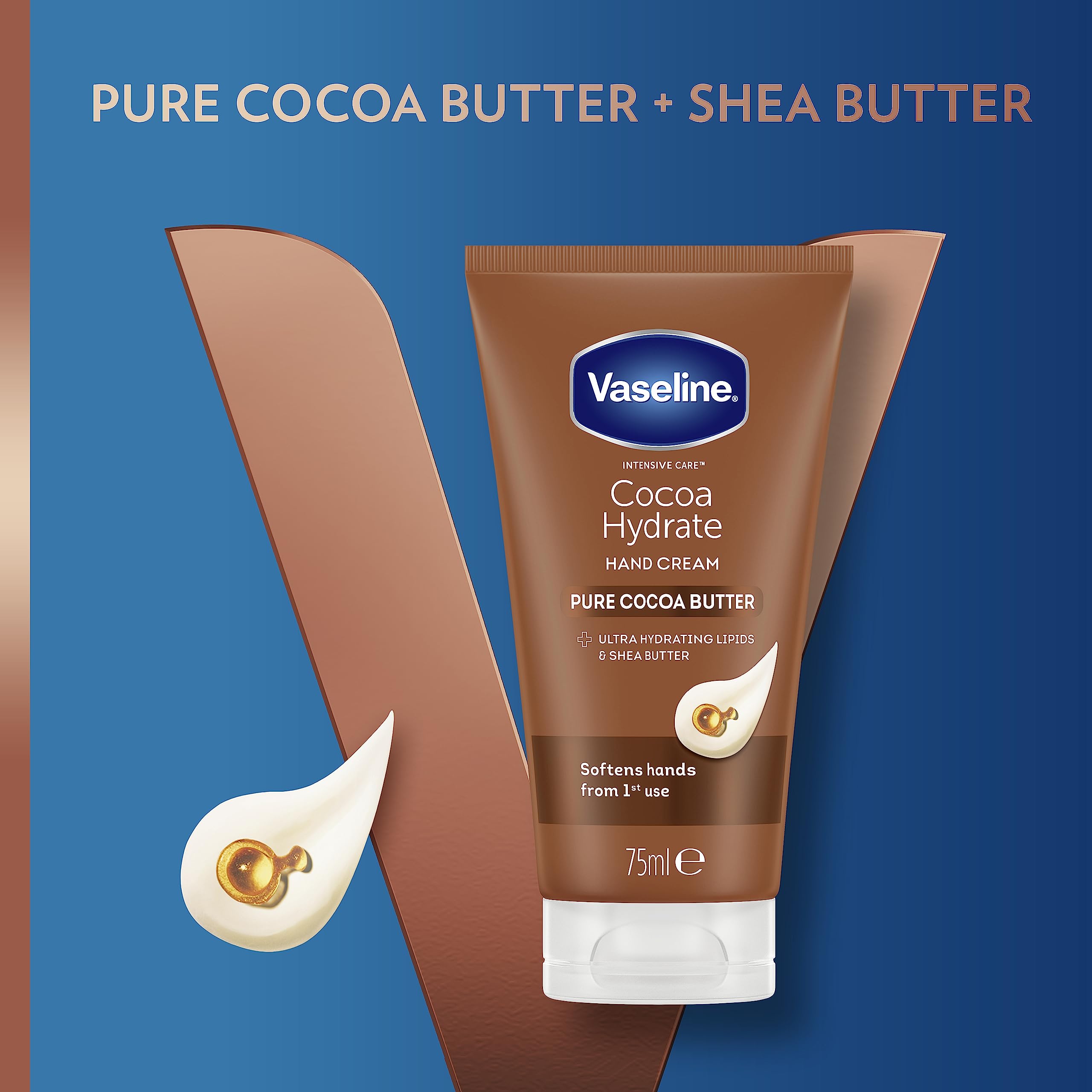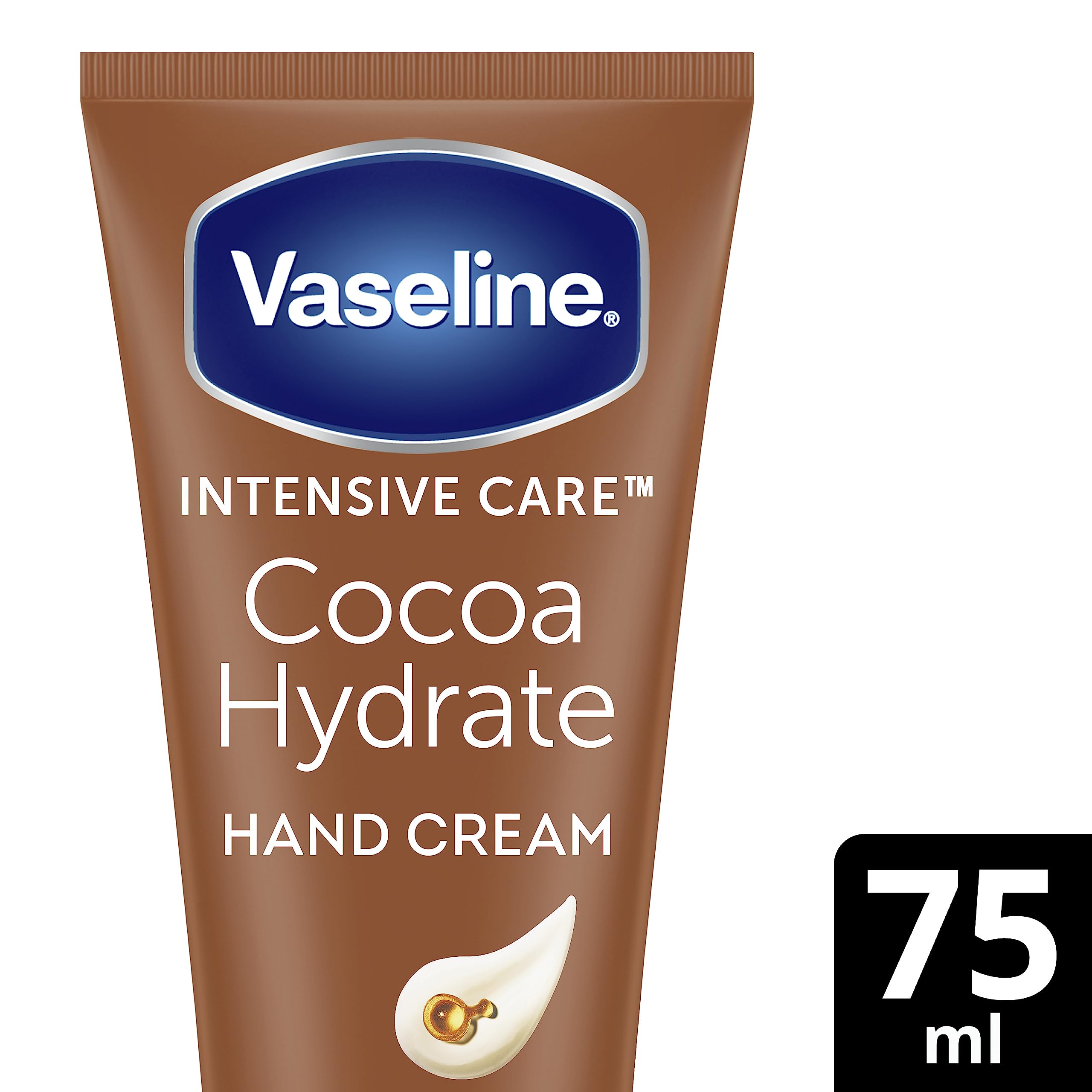 Our hands are often the first to suffer from dry skin, constantly exposed to the sun, low humidity, and harsh cleansers that damage the skin’s natural barrier. At Vaseline, we believe that healthy skin starts with deep-restoring moisture, which is why we've created Intensive Care Cocoa Hydrate Hand Cream to help relieve and soften dry hands after just one use. Formulated with ultra-hydrating lipids and shea butter, this moisturiser for dry skin helps to replenish moisture and fortify the skin barrier. It also contains pure cocoa butter and micro-droplets of triple-purified Vaseline jelly, which help to lock in moisture and form a protective layer on your skin. This sealing barrier speeds up your skin’s natural recovery process. To heal dry skin, use Vaseline Intensive Care Cocoa Hydrate Hand Cream daily and allow its rich yet quick-absorbing and non-greasy formula to provide intense moisturisation for your hands and nails. Our skin is the barrier between our bodies and the outside world, and its health is essential to our overall well-being. That’s why Vaseline is helping those who are underserved get better care for their skin, thereby working towards giving everybody, everywhere, access to the skin care they need.IngredientsAqua, Petrolatum, Glycerin, Stearic Acid, Isopropyl Palmitate, Glycol Stearate, Dimethicone, Triethanolamine, Glyceryl Stearate, Butyrospermum Parkii Butter, Theobroma Cacao Seed Butter, Cetyl Alcohol, Phenoxyethanol, Methylparaben, Parfum, Magnesium Aluminum Silicate, Carbomer, Propylparaben,Stearamide AMP, Disodium EDTA, Caramel, Maltodextrin, Coumarin, Geraniol, Hexyl Cinnamal, Hydroxycitronellal, Linalool.Manufacturer Contact InformationUnilever Dept ER, Wirral CH63 3JW UK