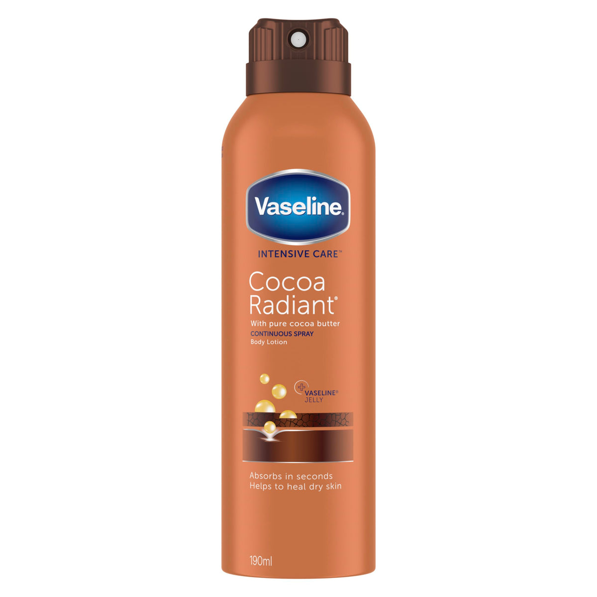 If you’ve got dry skin but lead a busy lifestyle, Vaseline Intensive Care Cocoa Radiant Spray Moisturiser 190 ml is for you. This quick, convenient spray lotion moisturises and absorbs in seconds* to help heal very dry skin. Caring for dry, sensitive skin couldn’t be easier. Vaseline Intensive Care Cocoa Radiant Spray Moisturiser is part of our range of Vaseline Intensive Care spray lotions designed for women who are pressed for time but still want effective moisturisation. Vaseline spray lotions are designed for easy application and even, all over coverage. The unique formula moisturises deeply and absorbs quickly to help heal very dry skin and has a warm, cocoa butter fragrance. An after shower lotion like Vaseline Intensive Care Cocoa Radiant spray is best for maximum moisturisation with limited time. Just spray on the non-greasy formula, rub it into the skin, and you’re done! Vaseline Intensive Care Cocoa Radiant Spray Moisturiser contains glycerine and micro-droplets of Vaseline Jelly to pull water into the skin and lock in moisture. This spray and go lotion is ideal for tackling very dry skin. Apply the lotion after showering, or whenever your skin feels dry, for moisturisation that gives you instantly softer skin. Not only is Vaseline Intensive Care Cocoa Radiant spray body lotion a convenient moisturising product, it’s also gentle on skin. It is dermatologically tested and suitable for sensitive skin so you can use it with confidence, knowing it will help heal your dry skin. *Within the stratum corneumIngredientsAqua, Isopropyl Myristate, Glycerin, Dimethicone, Sorbitan Isostearate, Theobroma Cacao Seed Butter, Tapioca Starch, Dihydroxypropyltrimonium Chloride, Polyglyceryl-3 Diisostearate, Stearic Acid, Sodium Hydroxide, Carbomer, Xanthan Gum, Ammonium Acryloyldimethyltaurate/VP Copolymer, Disodium EDTA, Pentasodium Pentetate, Parfum, Phenoxyethanol, Methylparaben, Propylparaben, Benzyl Alcohol, Benzyl Benzoate, Coumarin, Hydroxyisohexyl 3-Cyclohexene Carboxaldehyde, LimoneneDirectionsFor Best Results: Hold 4 inches (10cm) from skin and spray all over body in a continuous motion. Quickly rub into skin and go.Safety WarningWarning: For external use only. Pressurised container: protect from sunlight and do not store at temperatures exceeding 50°C. Do not puncture or incinerate can. Keep out of reach of children. Avoid contact with eyes. Avoid using on a floor that might become slippery. If nozzle clogs, rinse in warm water.Box Contains1 x 190 ml bottleManufacturer Contact InformationUnilever Dept ER, Wirral, CH63 3JW, UK.