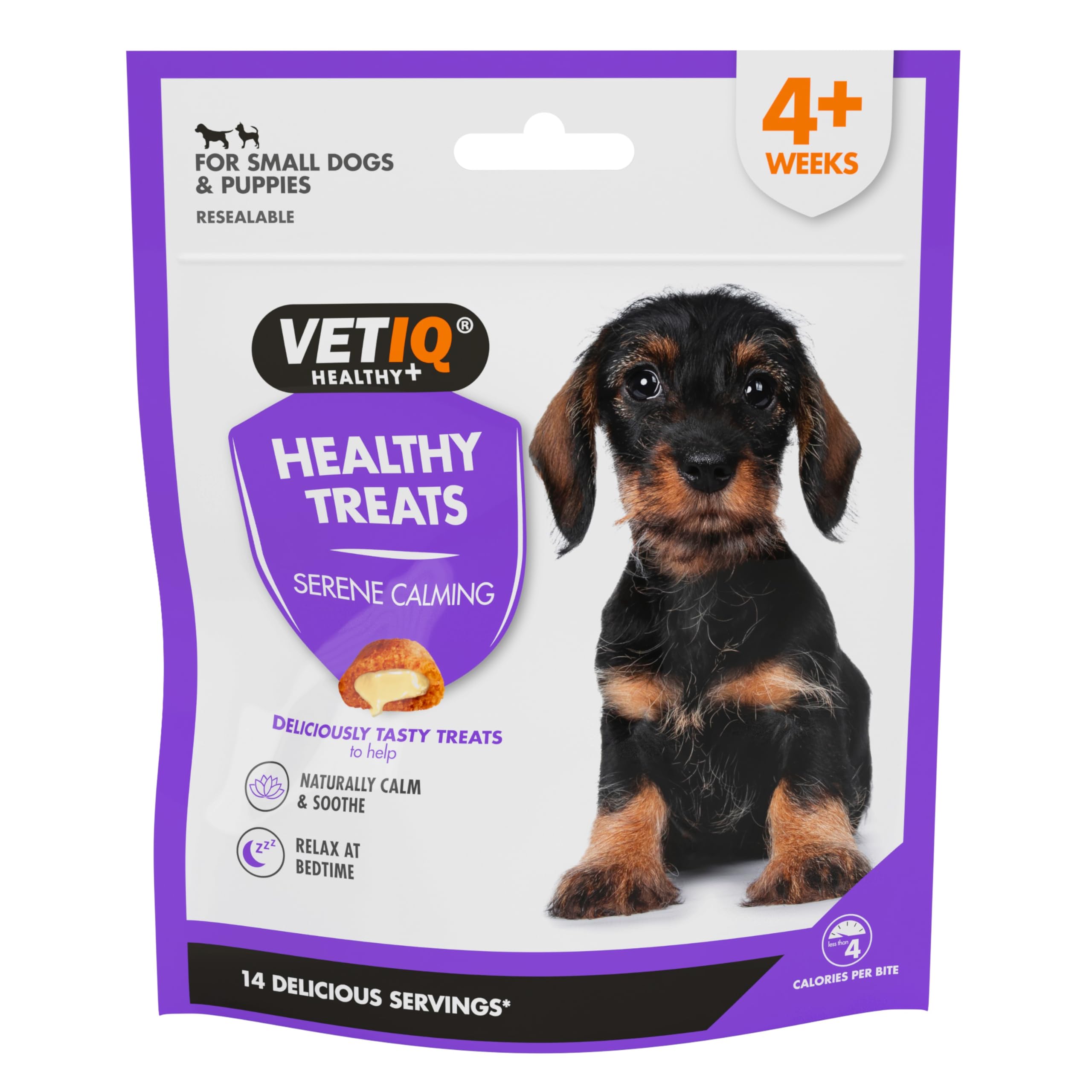 DescriptionProduct DescriptionVetIQ Calming Treats for Puppies contain a unique blend of lemon balm, chamomile and the amino acid L-Tryptophan to naturally calm and soothe your pet (e.g. separation anxiety, noise phobia, hyperactivity).... Not only do Calming Treats soothe, they are also a perfect bedtime treat... & as part of our promise we've removed all the artificial nasties. So your puppies can enjoy this tasty reward with all its benefits.IngredientsWheat flour, Canola Oil, Corn Starch, Poultry Protein, Flavouring, L-Tryptophan, Sodium Chloride, Ascorbyl Palmitate, Rosemary Extract, Lemon Balm, Vitamin E, Chamomile Oil, Vitamin A, Vitamin D3.DirectionsStore in a cool and dry placeBox Contains6 x VetIQ Calming treats 50g