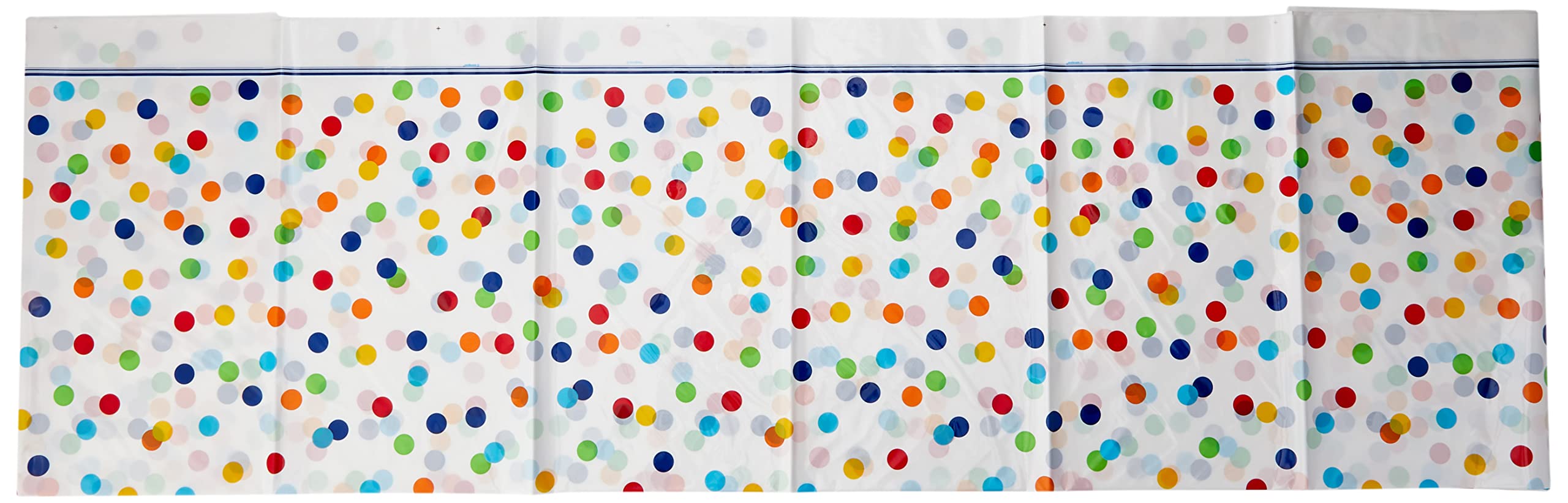 Brighten up your party table with a whole spectrum of color with this Rainbow Mini Polka Dot plastic Tablecloth. Adorned all over with colorful Dots, This plastic table cover will be just the thing for livening up your next birthday party, or any other Rainbow decorated event. Spread this tablecloth out over a lunch table to keep it protected from smeared frosting and cake crumbs. Or, display it on a refreshment table as a bright and cheery foundation for party snacks and sweets.