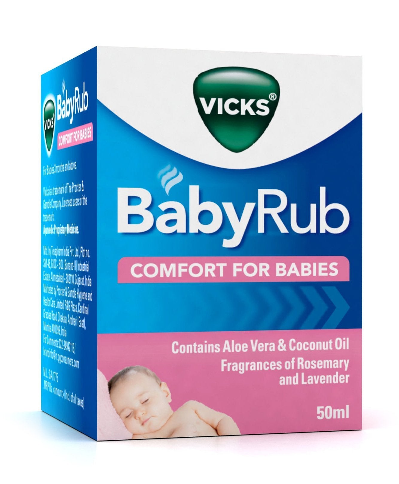 The vicks babyrub is a topical ointment that provides temporary relief from nasal congestion relief. It is a non-medicated cream containing aloe vera, eucalyptus, and scents of rosemary and lavender. This soothing formula does not irritate the delicate skin of your baby and provides fast relief from nasal congestion, cough, and stuffy nose. The vicks nasal vaporub is specially formulated for use on small babies. Vicks babyrub:gentle soothing creamfast relief from cough and congestionsafe to use on small babiespleasant and gentle aromanon-medicated formula. NOT SUITABLE FOR UNDER 6 MONTHS
