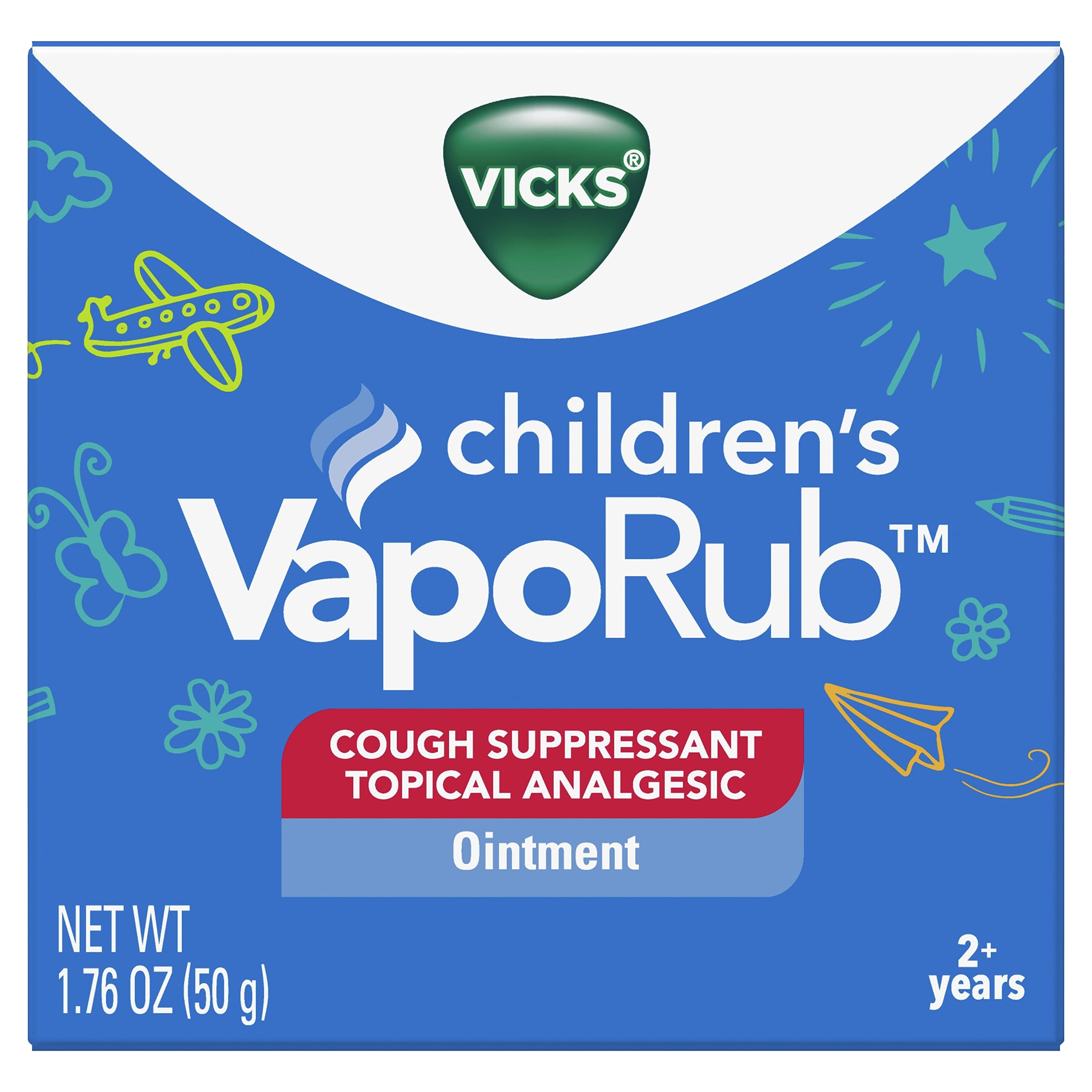 Vicks Children's VapoRub topical cough suppressant is brought to you by the world's #1 selling OTC cough and cold brand! Vicks Children's VapoRub is a topical cough over-the-counter medicine with medicated vapors. It starts working quickly and on contact to relieve your child's cough symptoms. Vicks Children's VapoRub can be used on children ages 2 and up. Children's VapoRub has three active cough suppressants that are clinically proven to relieve coughs: menthol, camphor, and eucalyptus oil. Use to temporarily relieve your child's cough that may be due to minor throat and bronchial irritation associated with the common cold. Children's VapoRub can also be used as a topical analgesic to temporarily relieve minor aches and pains in your child's muscles and joints. To use for cough suppression rub a thick layer on throat and chest, then cover with a warm dry cloth if desired. Keep your child's clothing loose around throat and chest to allow Vicks vapors to reach the nose and mouth. Use up to three times daily or as directed by a doctor. To use for minor muscle and joint aches and pains apply to affected area not more than three to four times daily.