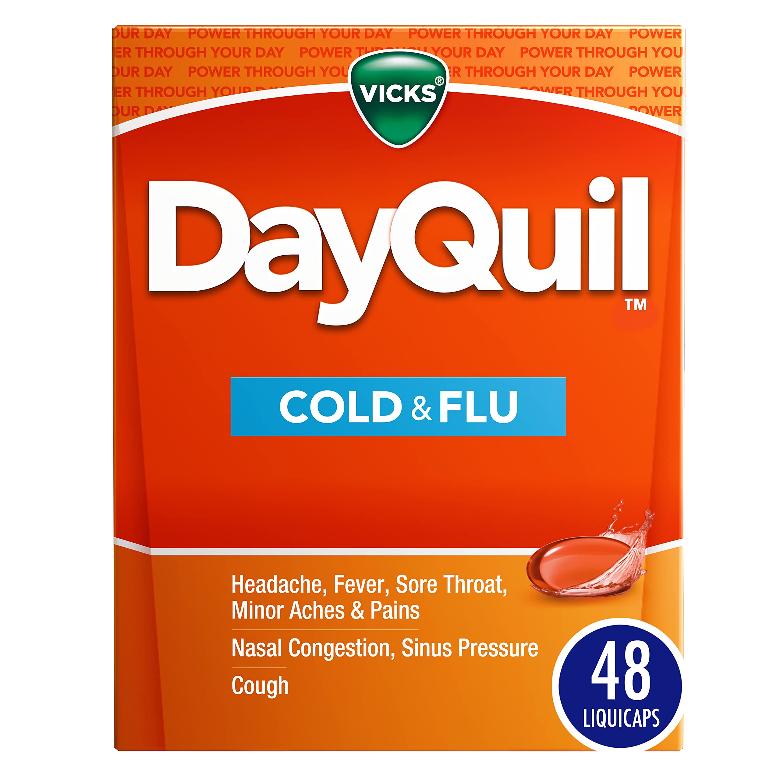 From the world's #1 selling OTC cough and cold brand†, Vicks DayQuil Cold & Flu Liquicaps provide powerful relief for your worst cold and flu symptoms. Vicks DayQuil Cold & Flu Liquicaps come in a non-drowsy formula so you can get on with your day. When you need fast relief, this powerful, daytime multi-symptom relief medicine treats headache, fever, sore throat, minor aches and pains, nasal congestion, sinus pressure, and cough due to minor throat and bronchial irritation. Nothing works faster. Vicks has been trusted for over 125 years to relieve your cold and flu symptoms. DayQuil is the #1 pharmacist recommended daytime cough, cold & flu brand* Active ingredients per dose (2 Liquicaps) for adults are acetaminophen 650 mg (pain reliever/fever reducer), dextromethorphan HBr 20 mg (cough suppressant), and phenylephrine HCI 10 mg (nasal decongestant). Store at room temperature; do not refrigerate. Take only as directed. Do not exceed 4 doses per 24 hours. Adults and children 12 years and over take 2 LiquiCaps with water every 4 hours. *2022 Pharmacy Times Survey of Pharmacists OTC Recommendations † Nicholas Hall’s global CHC sales database, DB20