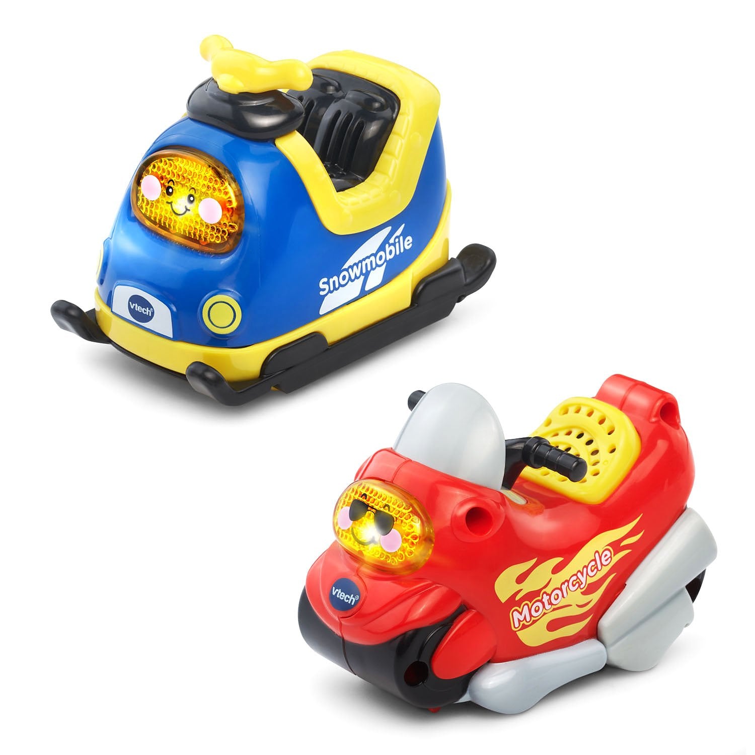 Go on an adventure with the Go! Go! Smart Wheels Motorcycle & Snowmobile by VTech. Roll the SmartPoint vehicles over SmartPoint locations, and they will respond with different phrases, music and more on Go! Go! Smart Wheels and Go! Go! Smart Animals playsets (each sold separately). Press each toy vehicle’s light-up button to hear three sing-along songs and learn the letter “M”, “S” and the vehicle name. Push the vehicles to hear fun sounds and melodies. While a melody is playing, push them again to add fun sound effects. Inspire the imagination and build an entire world by collecting other Go! Go! Smart Wheels, Go! Go! Smart Animals and Go! Go! Smart Friends figures and playsets (sold separately).