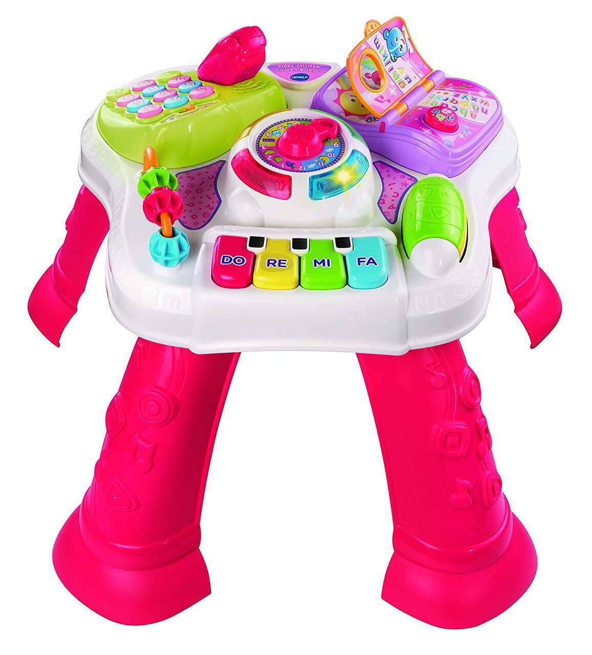 Product DescriptionThe Play & Learn Activity Table introduces numbers, colours, animals, musical notes, daily routines, and more. With light-up buttons and lots of manipulative features, your child will learn age-appropriate curriculum in a fun and engaging way. The role-play phone and interactive clock encourage imitative and independent play, while the piano keys play cheerful music and the balloon button plays cute sing-along songs.Removable legs allow for easy storage and sit-down play. The Activity Table includes five sing-along songs and eight fun melodies, features lots of fun phrases in a British voice for baby to learn and recognise, and encourages development of motor skills and hand-eye coordination.Great melodies and sing-along songsThe Activity Table has eight fun melodies and five sing-along songs. The melodies include 'Hey Diddle Diddle', 'Bingo', 'Hickory Dickory Dock', 'Oh Susannah', 'Hot Cross Buns', 'Twinkle, Twinkle, Little Star', 'The Alphabet Song', and 'Mulberry Bush'.Lots of activitiesThe Play & Learn Activity Table has lots of great activities to keep your little one entertained. All of these great activities are accompanied by flashing lights and sounds to keep your little one engaged.The number buttons will help to teach numbers; spin the clock hand to learn about what to do at different times of the day; pick up the phone to call animal friends; press the piano keys to learn colours and hear music notes and melodies; and turn the book page and press the circle button to learn about letters and shapes and hear fun sing-along songs.Automatic shut-offTo preserve battery life, the Play & Learn Activity Table will automatically power down after approximately 60 seconds without input. The unit can then be turned on again by pressing any button.Safety WarningnoBox Contains1 x Play and Learn Activity Table;2 x AA "TRY ME"batteries (included);Instruction ManualNOTE: The "TRY ME" batteries are just to check the product, they may be dead while in storage. If item is not working try new, genuine, good quality batteries.