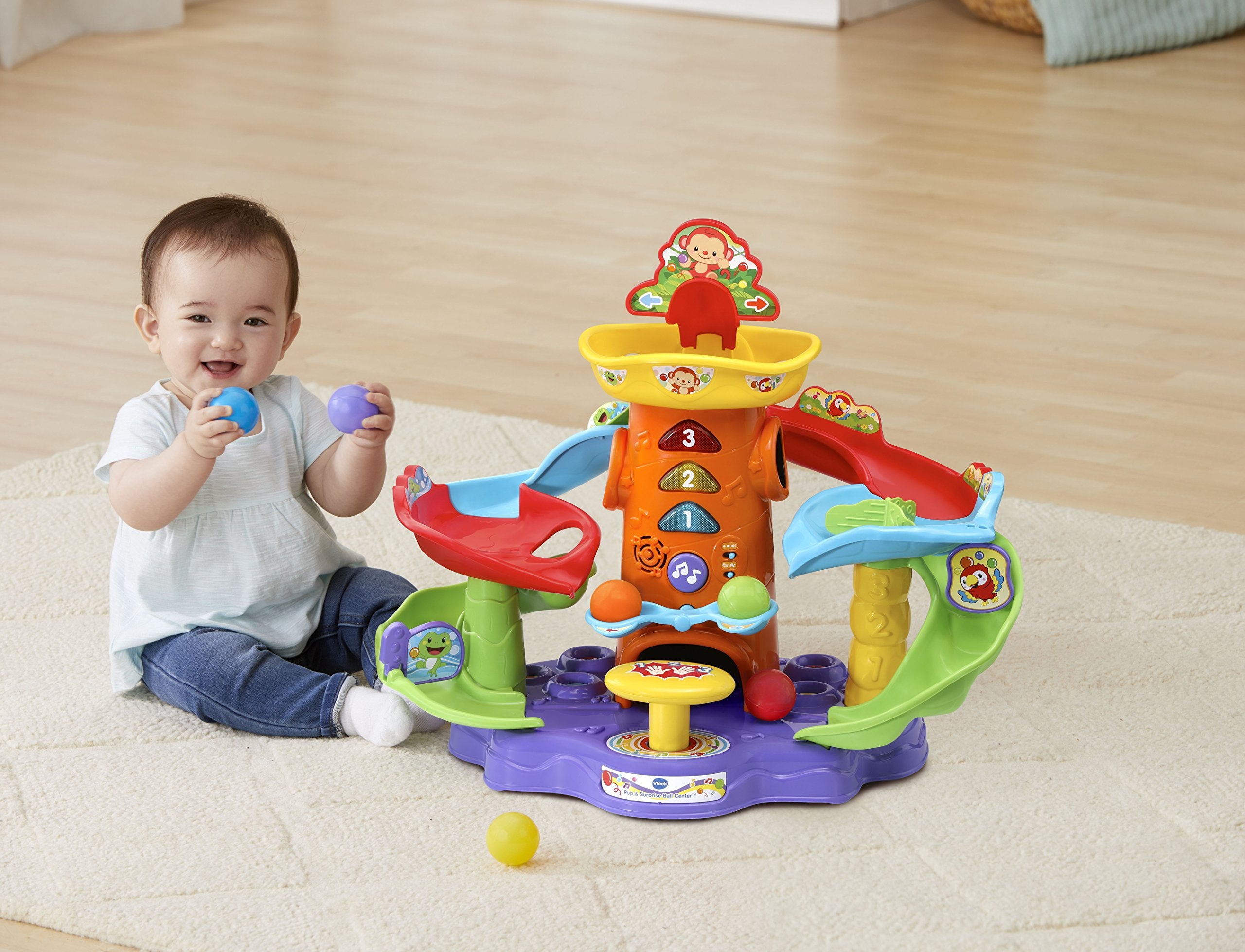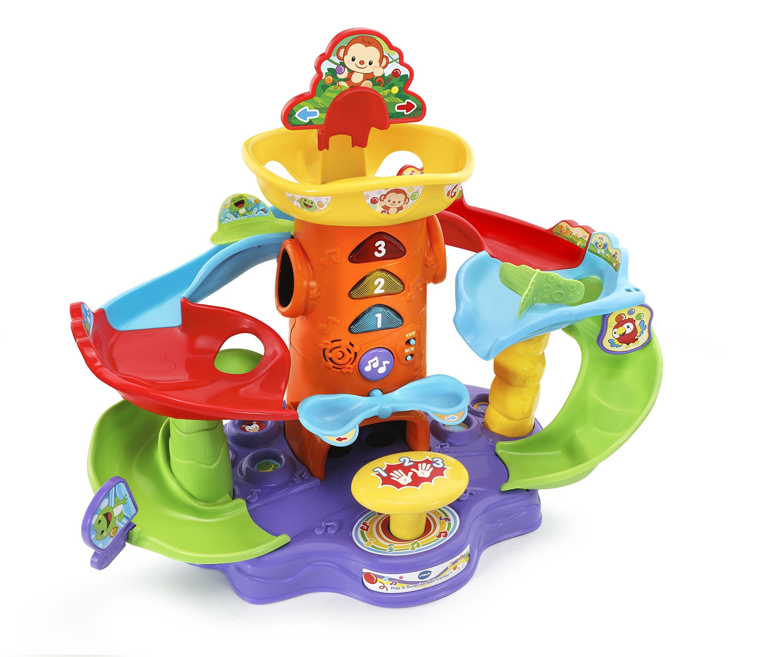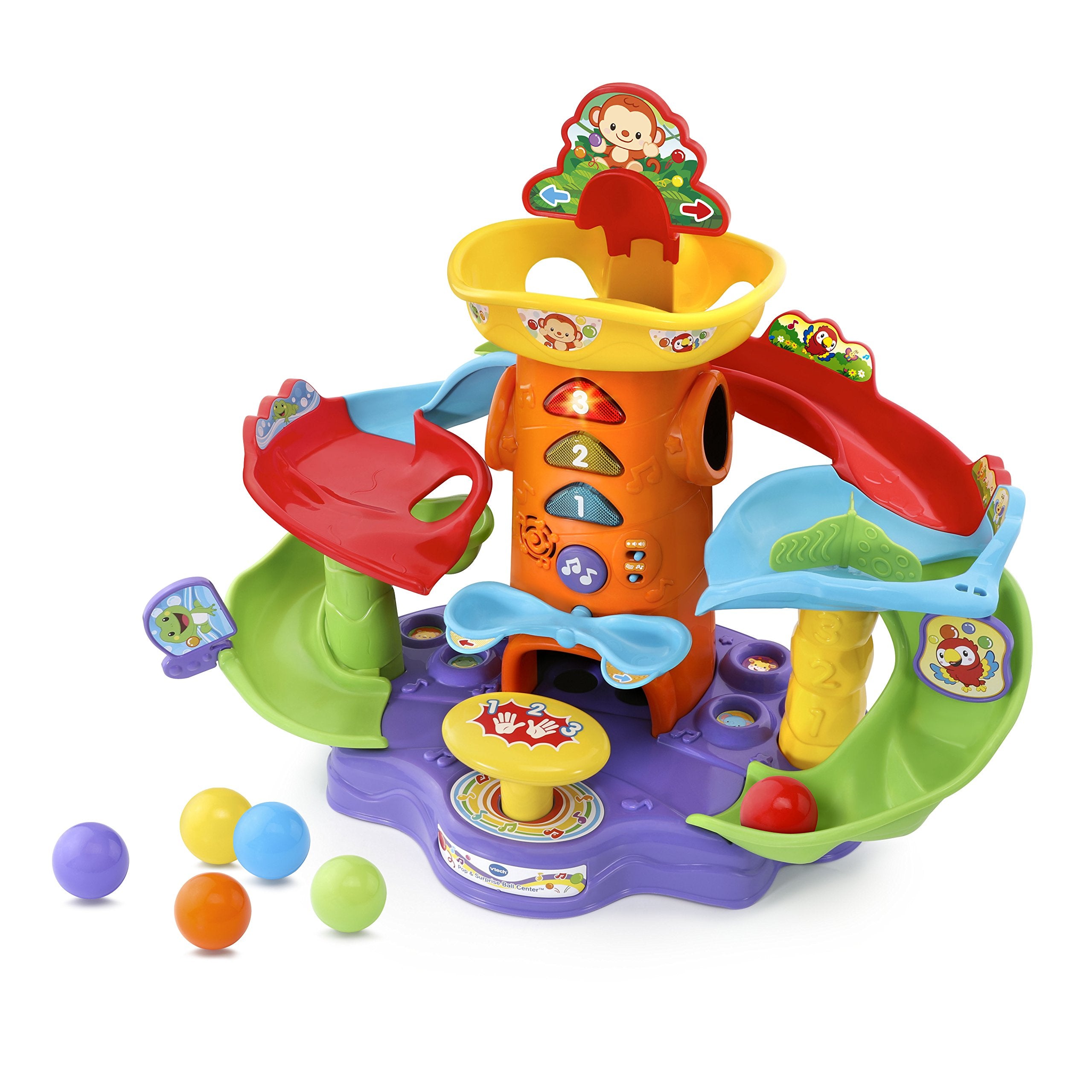 Colorful balls, twisting slides and cheerful animals make playtime fun with the Pop-a-Balls Pop & Surprise Ball Center. The two interactive twisting ball tracks are filled with friendly animals that will stop and start the balls or redirect the rolling. Explore cause and effect relationships by loading the balls into the ball launcher and pressing the big yellow button to send the balls up the tower, where they’ll pop out of three different locations. Press the seesaw to launch the balls onto the slides. The music button introduces colors, animals and plays a variety of melodies. This tower is filled with ball popping fun!