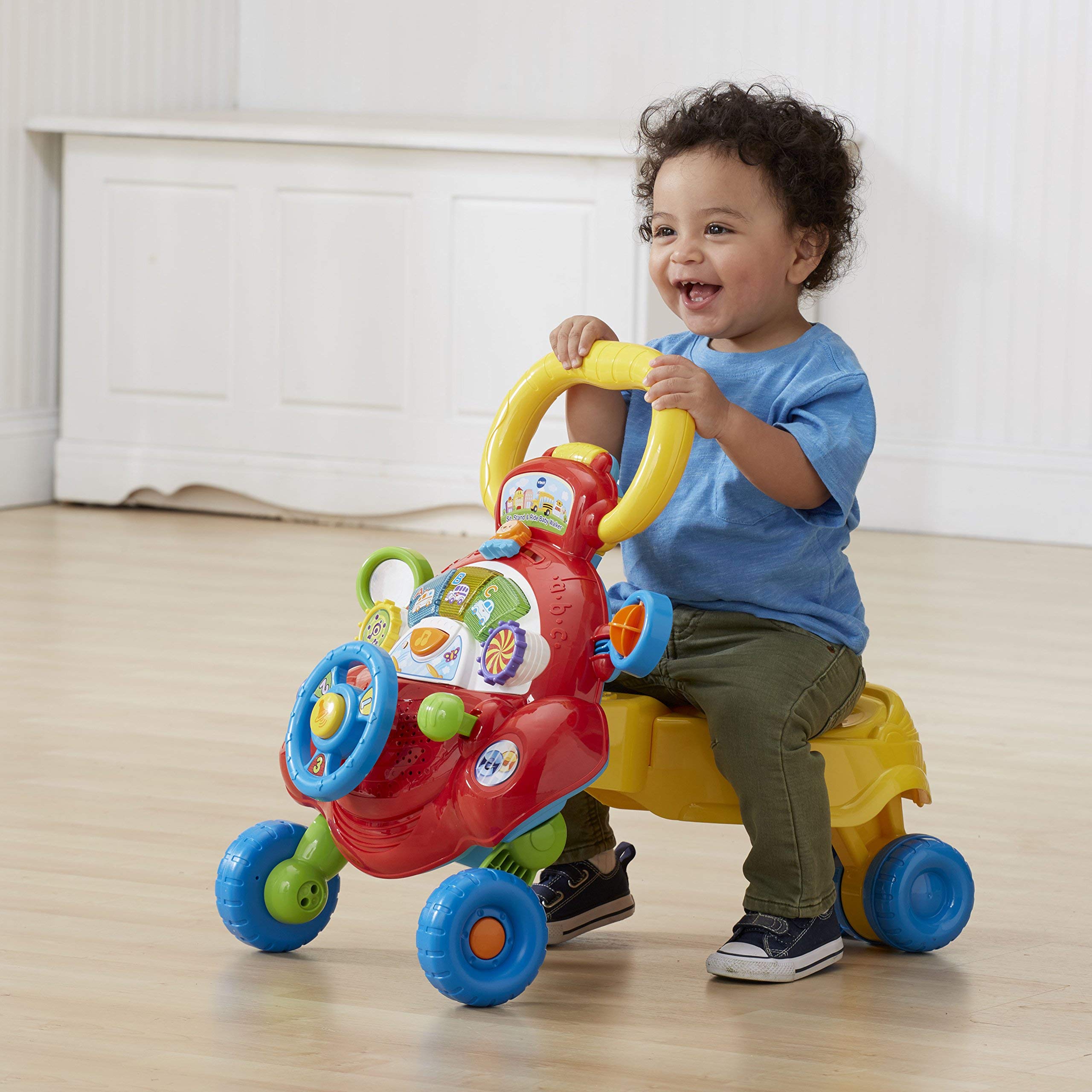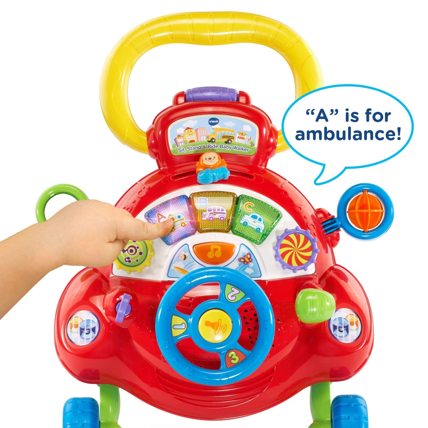 3 toys in 1 - Activity Panel, Walker, and Ride-On! Activity panel features a music button and 3 light-up buttons that teach animals, colors, and numbers. Spinning gears, mirror, sliding car, and steering wheel all help build fine motor skills. Intended for ages 12 months to 3 years.