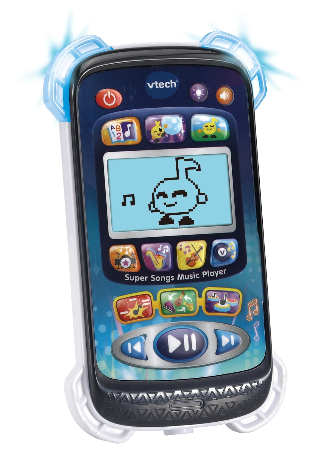 EDUCATIONAL FUN: Embark on an exciting learning journey with the Super Songs Music Player by VTech. This interactive device features a charming animated character that makes exploration and education a delight. | KID-SAFE ENTERTAINMENT: Keep your child's ears protected with the included kid-safe headphones, ensuring a volume limit for a safe and enjoyable musical experience. Jam to 10 sing-along songs and 45 melodies with peace of mind. | DIVERSE MUSIC STYLES: Encourage musical exploration with 4 distinct albums that cover a range of genres, including Rock, Jazz, Classical, and Pop. This diversity encourages young listeners to discover the world of music. | INTERACTIVE MODES: Choose between the energetic Dance Party mode, where kids can dance along to step-by-step instructions, or the soothing Chill Zone mode for relaxation and unwinding. The Super Songs Music Player caters to different moods and preferences. | MUSICAL GAMES AND VISUAL APPEAL: Engage in 3 entertaining musical games, master rhythm, explore various instruments, and collect cheeky music notes. The device features light-up bumpers and a backlit screen with an animated character, adding visual appeal to the learning and entertainment experience. Let's jam and learn with the Super Songs Music Player!