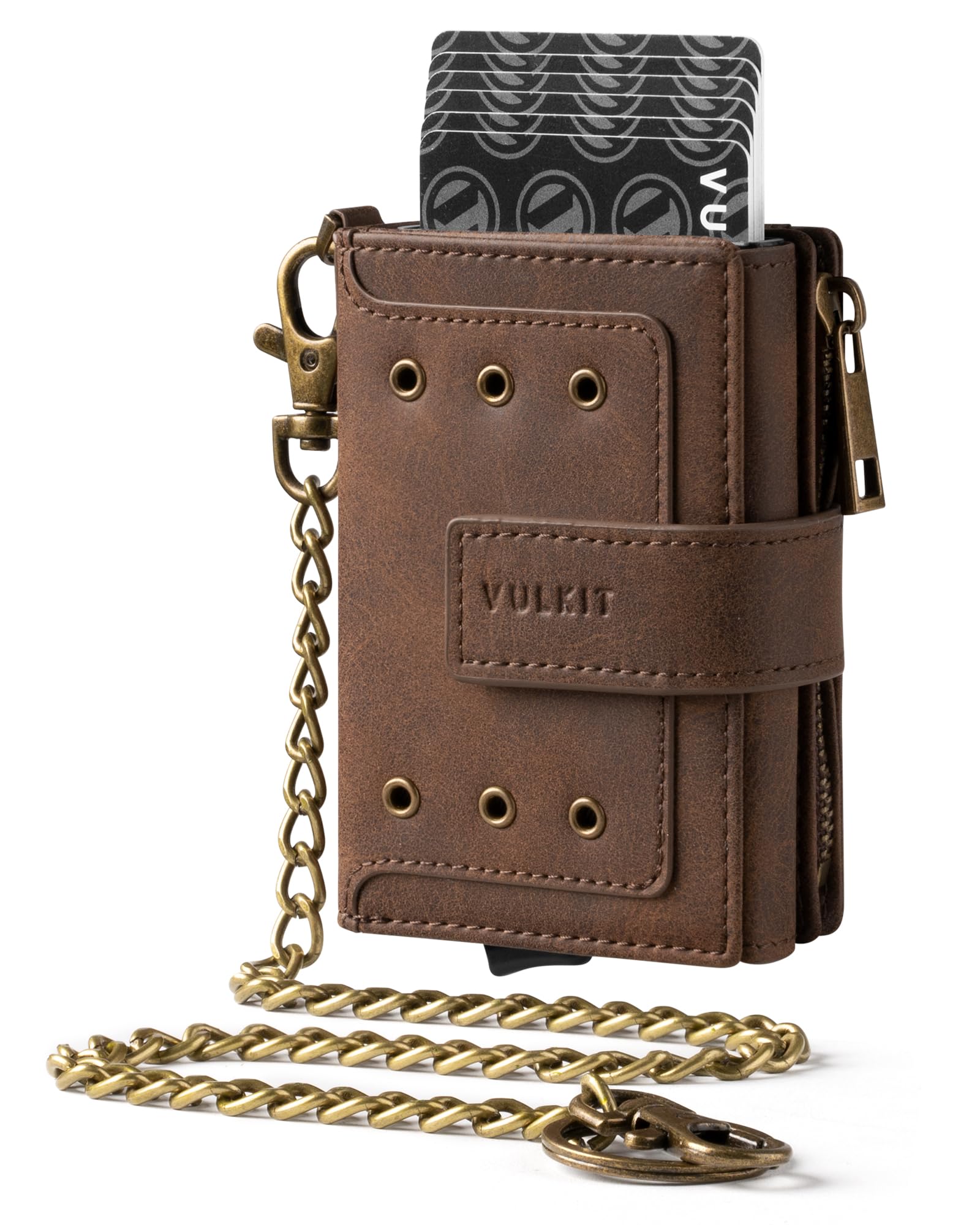 Introducing the VULKIT Trifold Mens Smart PU Leather Wallet with Chain - the perfect gift for men! This sleek and stylish wallet offers maximum functionality and security, making it an ideal choice for the modern man. With a maximum capacity of 10 cards, this wallet provides ample space for all your essential cards. The RFID-protected aluminum POP UP card case ensures that your sensitive information remains safe from electronic theft. The innovative push-button mechanism allows for quick and easy access to your cards, making it a convenient choice for everyday use. The trifold design includes 3 extra card slots, an ID window, and a zipper pocket for coins or an Airtag. Additionally, there is a dedicated compartment for bills or banknotes, keeping your cash organized and easily accessible. Available in four stylish colors - black, brown, blue, and coffee brown - this wallet not only offers functionality but also adds a touch of sophistication to your ensemble. Complete with a sturdy chain, this wallet can be securely attached to your belt or bag, ensuring that you never misplace or lose it. Experience the simplicity and smart design of the VULKIT Trifold Mens Smart PU Leather Wallet with Chain. Upgrade your everyday carry with this minimalist wallet that combines style, convenience, and security.