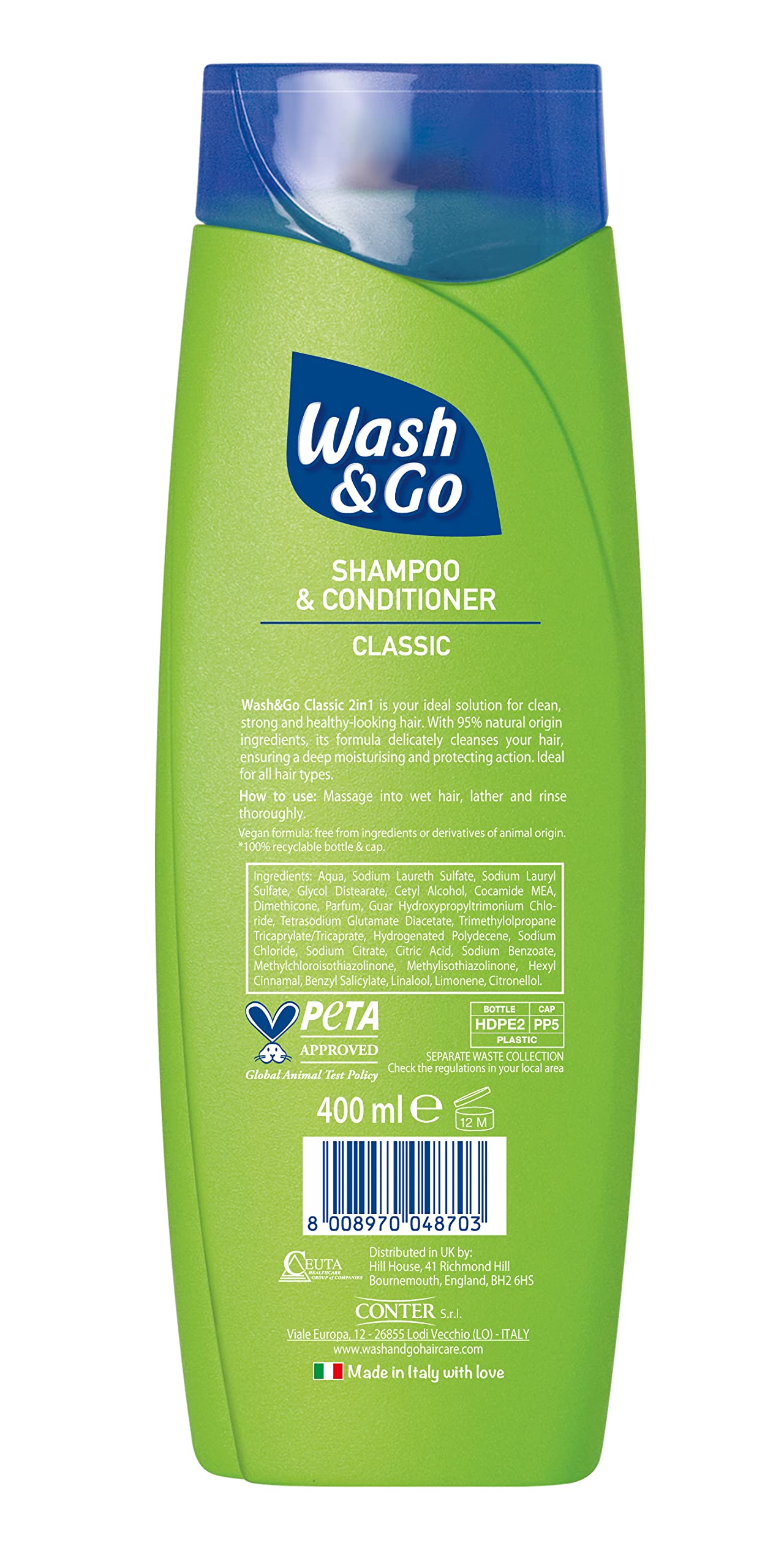 The ideal solution for clean, strong & healthy hair. Its formulation gently cleanses ensuring, at the same time, a deep Moisturising and protective action.Box ContainsWash & Go 2-In-1 Classic Shampoo and Conditioner, 400 ml (Pack of 6)