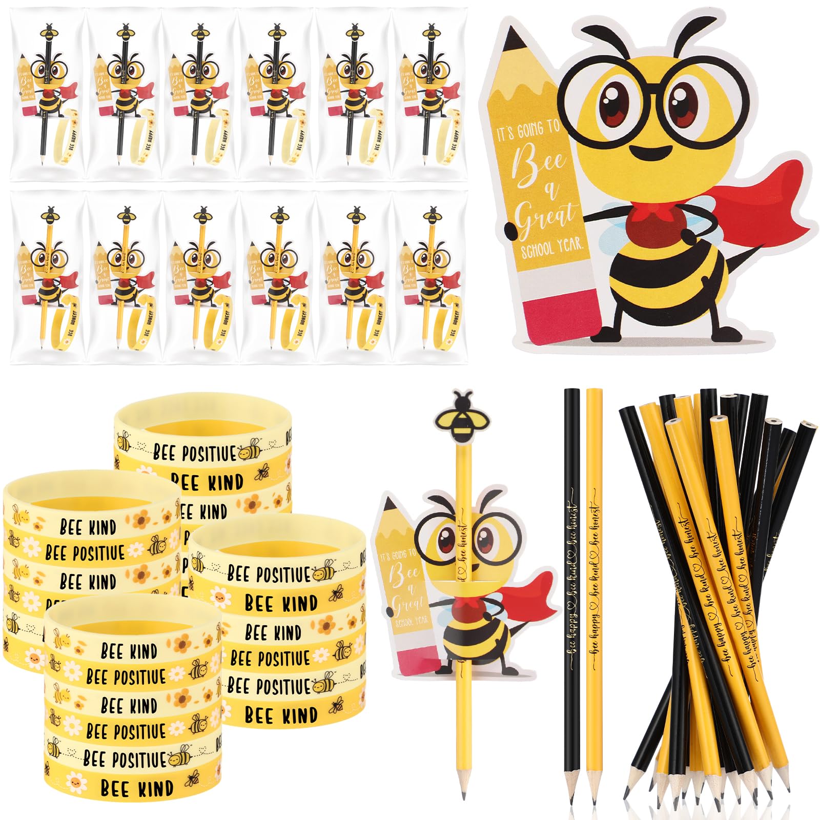 Weekgrat 24 Sets Bee Decorations for Classroom Cute Bee Pencil Bee Erasers Bulk Silicone Bracelet Inspirational Bee Cards Stocking Stuffers for Class Students Gifts from Teacher Classroom Decor