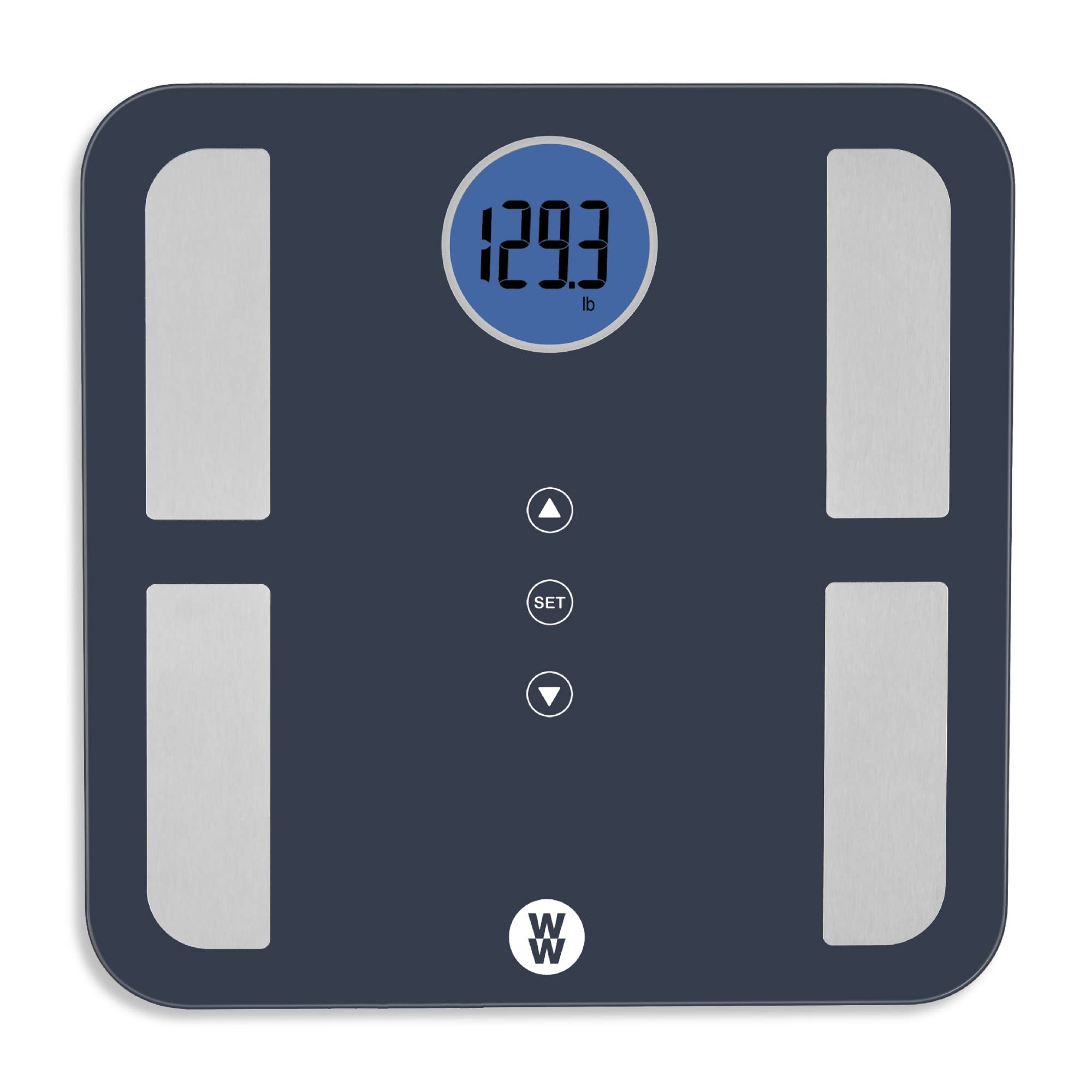 Keep track of multiple body measurements with the Body Analysis Scale with Jumbo 2.6" Round Backlit Display by WW Scales by Conair. Step on the scale, and in moments, 5 body analysis measurements are available via bio-impedance analysis (BIA): body fat, body water, bone mass, muscle mass and BMI. Results are calculated for up to 4 users and displayed clearly on the easy-to-read jumbo 2.6" round LCD display with blue backlight and silver bezel. Download the free WW Tracker Scale by Conair App to manually enter, track, and chart body measurements over time. The scale is built with a durable, impact-resistant tempered glass platform and weighs up to 400 lbs./182 kg. The modern design, gray styling, and rounded corners complement any bedroom or bathroom with a clean, contemporary look. Scale operates on 3 AAA alkaline batteries (included).