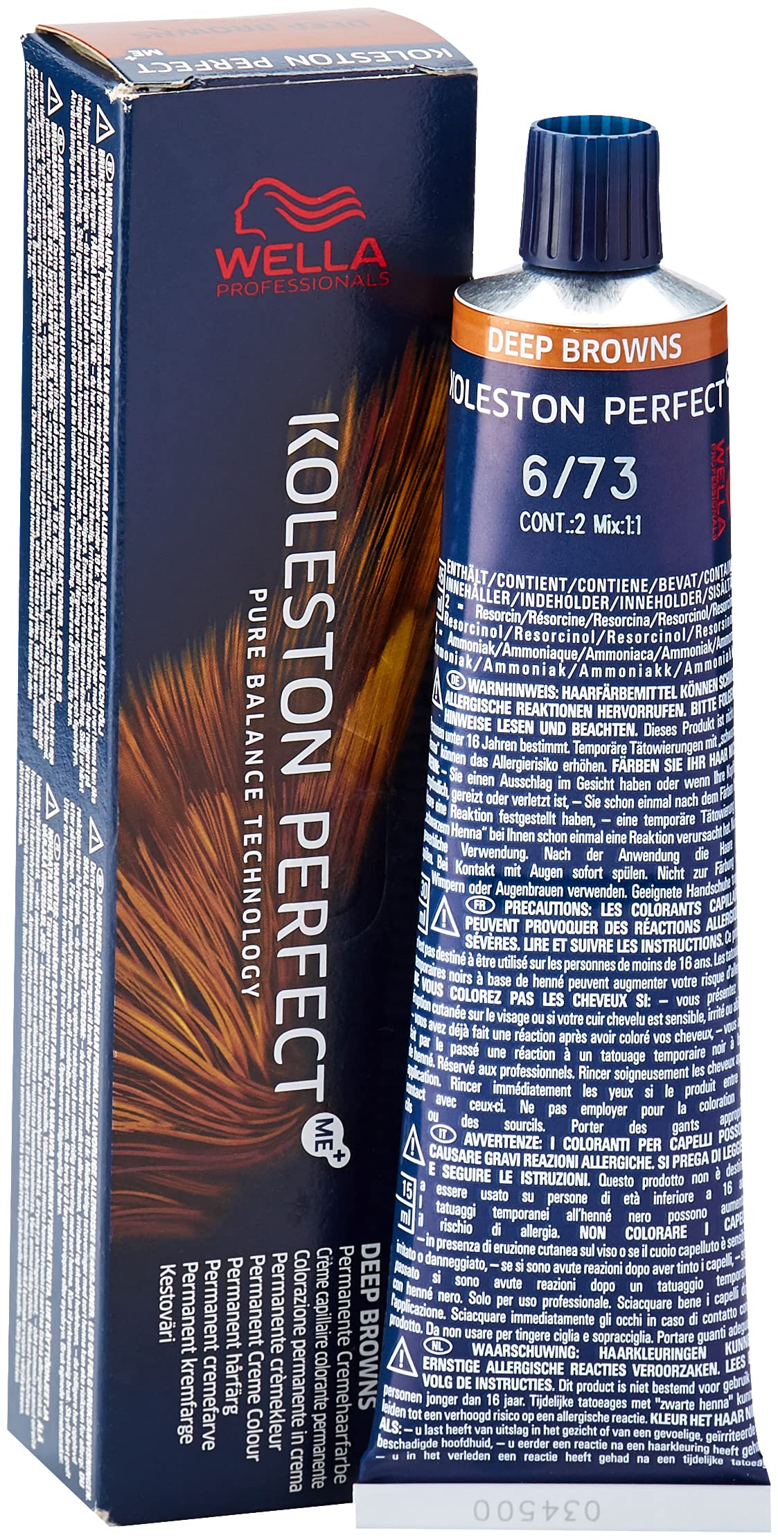DescriptionProduct DescriptionWella professionals KOLESTON perfect me+ deep brown permanent hair colour cream is pure, balanced colour results with natural depth and shine. Our purest permanent hair colour ever with me+ technology. Koleston perfect is the first professional hair colour brand to feature breakthrough technologies. Reduce the formation of free radicals for irresistible hair quality. Alongside pure balance technology which actively reduces free radicals and provides even better protection for the hair bonds during the colouring process. Up to 100 percent grey coverage. Comes in no. 6/73 Dark Blonde Brown-Gold colour shade.IngredientsAqua, Cetearyl Alcohol, Glyceryl Stearate SE, Ammonium Hydroxide, Sodium Laureth Sulfate, Glycol Distrearate, Lanolin Alcohol, 2-Methoxymethyl-p-Phenylenediamine, Sodium Lauryl Sulfate, Resorcinol, Sodium Sulfate, Sodium Cocyl Isethioate, Sodium Sulfite, Ascorbic Acid, M -Aminophenol, Perfume, Hydroxyethyl-3, 4-Methylenedioxyaniline HCl, Disodium EDTA, 2-Methylresorcinol, Tocopherol.