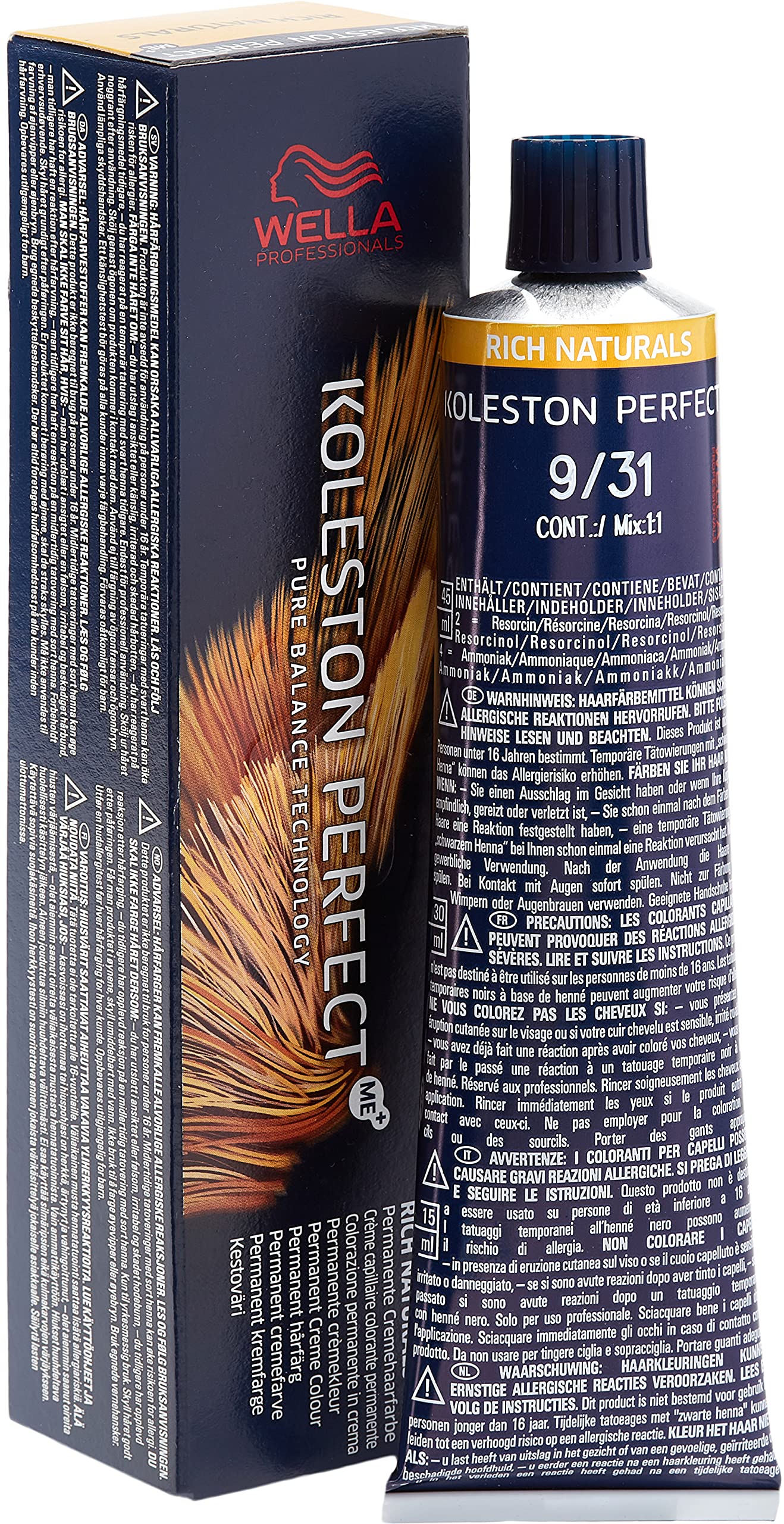 Product DescriptionWella professionals KOLESTON perfect me+ rich naturals permanent hair colour cream is pure, balanced colour results with natural depth and shine. Our purest permanent hair colour ever with me+ technology. Koleston perfect is the first professional hair colour brand to feature breakthrough technologies. Reduce the formation of free radicals for irresistible hair quality. Alongside pure balance technology which actively reduces free radicals and provides even better protection for the hair bonds during the colouring process. Up to 100 percent grey coverage. Comes in no. 9/31 Light Blonde Gold Ash colour shade.IngredientsAqua/ Water/ Eau, Cetearyl Alcohol, Propylene Glycol, Ammonia, Dicetyl Phosphate, Trisodium Ethylenediamine Disuccinate, Ceteth-10 Phosphate, Steareth-200, Ammonium Sulphate, Sodium Sulphate, Xanthan Gum, Sodium Hydroxide, Sodium Sulfite, Ascorbic Acid, Parfum/ Fragrance, 2-Methoxymethyl-p-phenylenediamine, 2-methylresorcinol, CI 77891/ titanium dioxide, disodium EDTA, 1-naphthol, 2-amino-6-chloro-4-nitrophenolDirections[LIST_OF_STEPS_IN_GERMAN]