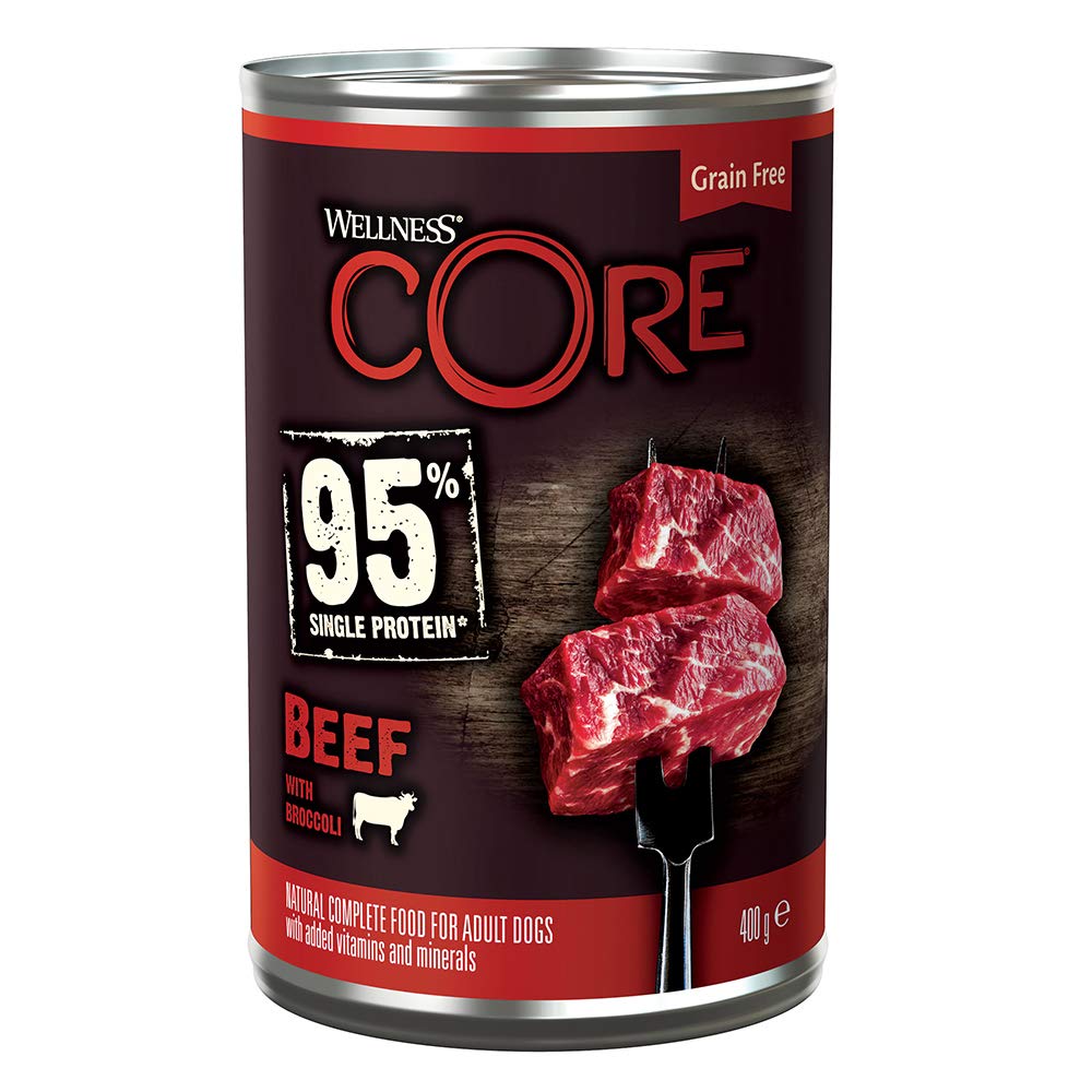 Product DescriptionA complete and balanced meal: This tasty paté is made with 95% beef combined with healthy veggies. Grain free and hypoallergenic due to limited ingredients and only one single protein source.Feeding recommendations: Fed Alone: Small Dog (1kg - 9 kg): 100 g - 550 g ¼ - 1 1/3 can; medium Dog (10 kg - 32 kg): 570 g - 1 400 g 1 1/3 - 3 ½ cans; large Dog (33 kg - 50 kg): 1 440 g - 2 000 g 3 2/3 - 5 cans. Fed with Wellness CORE dry: Reduce dry by 35 g for every can. IngredientsCOMPOSITION: 95% Beef [66% (Hearts, Meat, Liver, Lungs), 29% Beef Broth], 4% Broccoli, 1% Minerals. Nutritional Additives (per kg): Vitamin D3 200 IU, Zinc sulphate, monohydrate 15 mg, Manganous sulphate, monohydrate 3 mg, Calcium iodate, anhydrous 0,75 mg.Guaranteed Analysis: Protein 11,3%, Fat Content 7,3%, Crude Fibres 0,4%, Crude Ash 2,4%, Moisture 72,0%.Box Contains6 x 400 g Wellness CORE 95% Beef with Broccoli