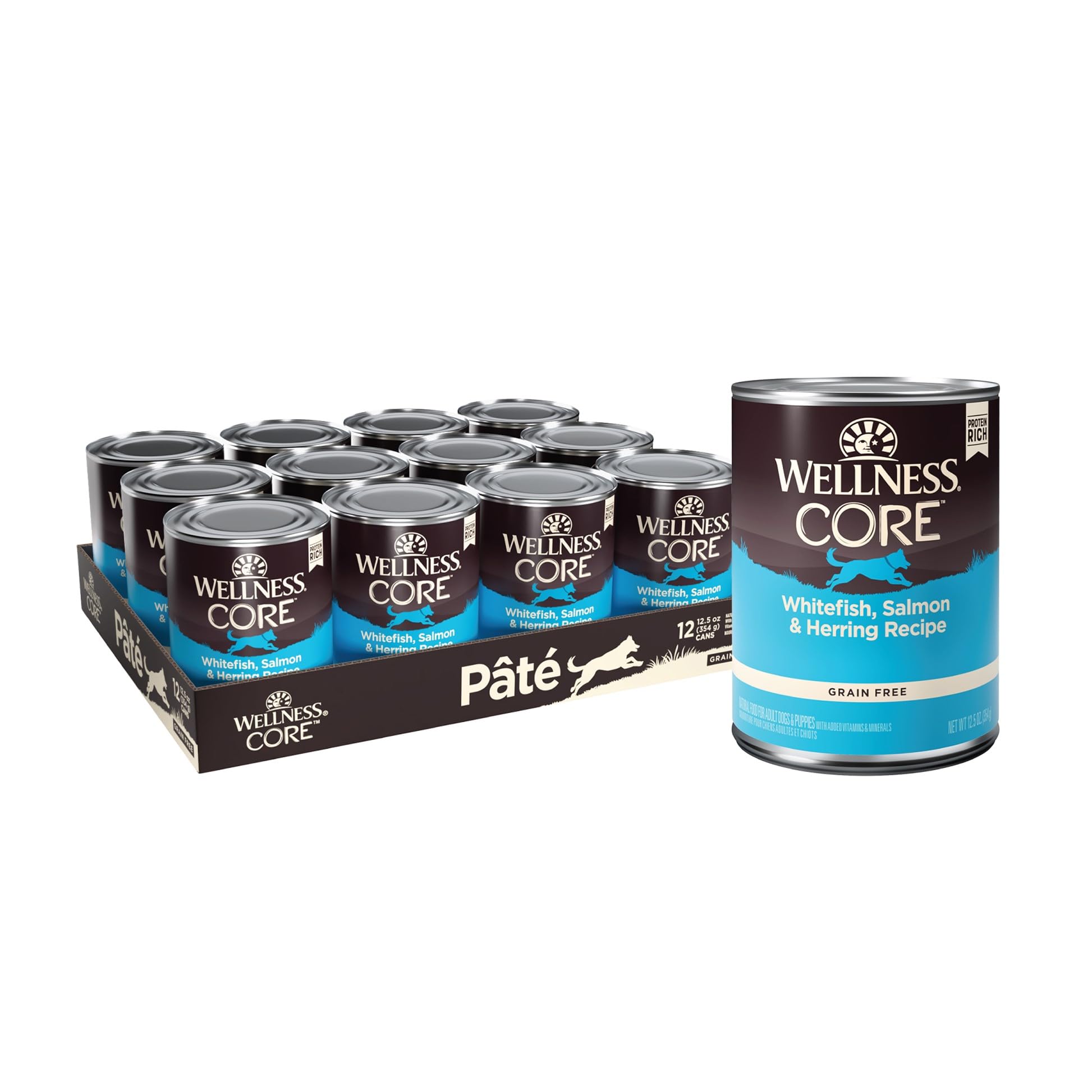 Wellness CORE Natural Grain Free Wet Canned Dog Food Salmon, Whitefish & Herring Recipe is healthy, gluten free, grain free dog food made with chicken, salmon, whitefish, herring, sweet potatoes, greens and botanicals to help support inner wellness and fortified with vitamins and minerals, including fish and flax omega blend for healthy skin and coat. It can be served as a complete, balanced meal or can be added on top for an extra boost of protein. Wellness CORE dog food recipes are crafted on the nutritional philosophy that dogs thrive on a diet mainly comprised of meat. Each grain free, nutrient-rich formula provides high quality protein for your dog.