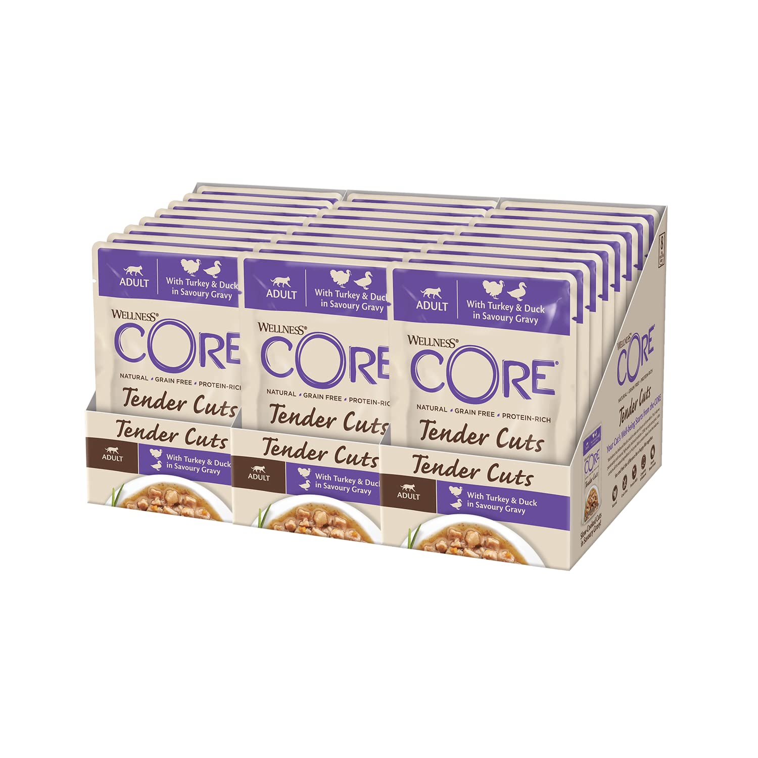 Product DescriptionWith taste in mind but health at heart: Tender Cuts cat wet food pouches are slow-cooked tasty proteins served in a delightfully savoury gravy. This sensitive cat food wet is a healthy, natural way to help hydrate your cat. Tender Cuts complete and balanced meals are sure to please even the most finicky of eaters.Feeding recommendations: Fed alone: About 4-5 per 4-6 kg body weight daily. Fed with Wellness CORE dry: Reduce amount. IngredientsChicken Broth, Chicken 19%, Turkey 6%, Duck 6%, Potato Starch, Eggs, Carrots 3%, Chicken Liver, Minerals, Cranberries, Blueberries, White Sweet Potatoes. Taurine 1,540 mg, Vitamin A 14,240 IU, Vitamin D3 420 IU, Vitamin E 64 mg, Zinc chelate of amino acids, hydrate 113 mg, Ferrous chelate of amino acids, hydrate 77 mg, Manganese chelate of amino acids, hydrate 27 mg, Cupric chelate of amino acids, hydrate 18 mg, Potassium Iodide 0.2 mg, Sodium Selenite 0.065 mg.Guaranteed Analysis: Protein 7.0%, Fat Content 5.4%, Crude Fibres 0.1%, Crude Ash 1.4%, Moisture 80%.DirectionsAverage cat 4-6 kg: 4-5 p pouches per day. Fed with Wellness Core Dry: Reduce Dry by g for every 1 pouch.Box Contains24 x 85 g Wellness CORE Tender Cuts with Turkey and Duck in Savoury Gravy