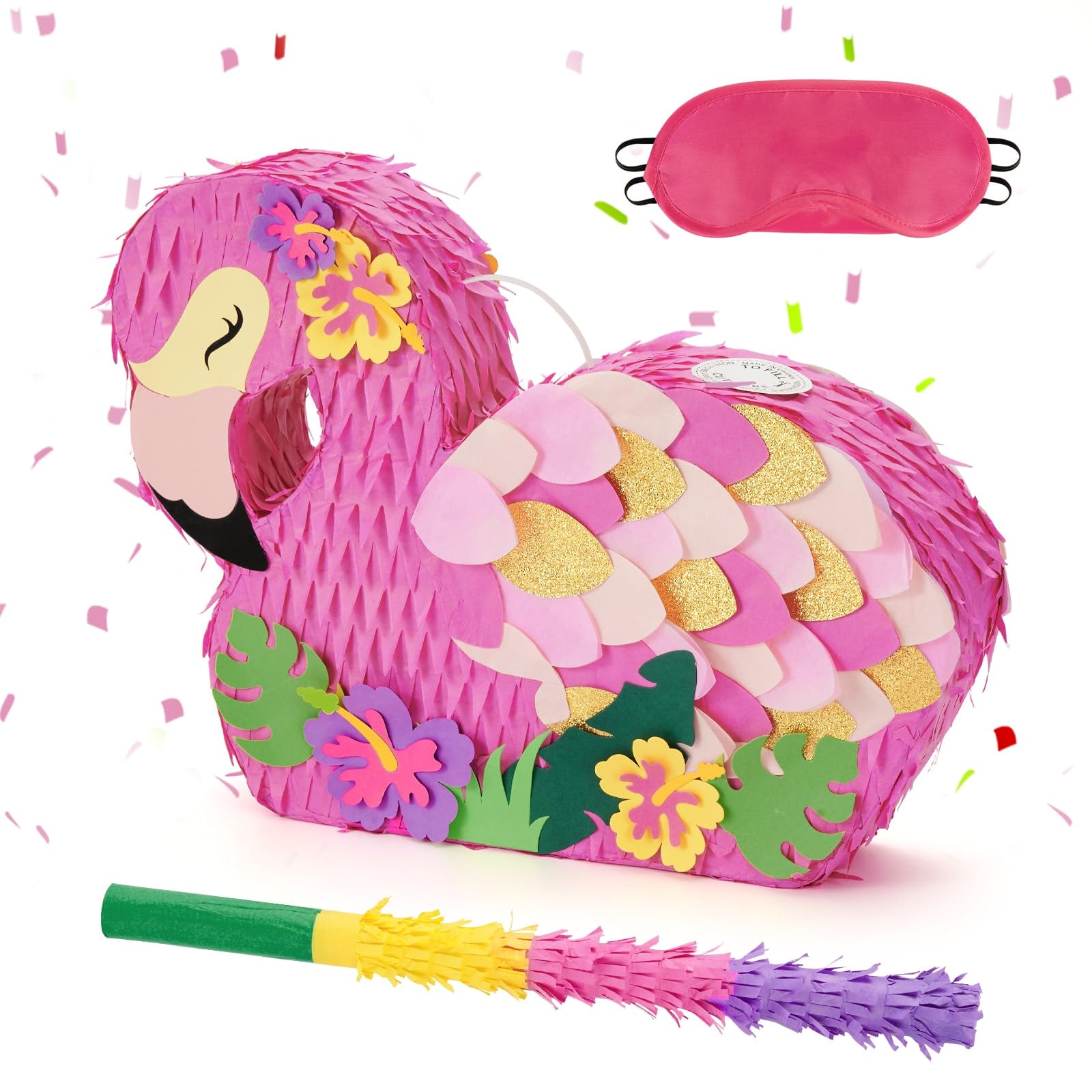 1.?UNIQUE DESIGN? - Our pink pinata designed in tropical flamingo shape, decorate with vibrant flowers and leaves. The colorful kids pinata will bring the summer vibes to your theme party. 2.?SUPERIOR MATERIAL? - Made of corrugated paper, and decorated with crepe paper on bond paper. Our pink flamingo pinata is not only visually stunning but also durable, ensuring that it can withstand all the excitement and enthusiasm of the party. 3.?PACKAGE CONTAINS? - You will receive 1 piece flamingo pinata, 1 pink blindfold and a colorful knocking stick. Easily bring you an unforgettable party game experience. 4.?HOW TO PLAY? - Fill the pinata with confetti, candies, snacks, little toys, gifts or other small fillers to your liking. Then invite your party guests to hit the pinata in turn until it releases your pinata surprise. Watch as laughter and joy fill the air, creating unforgettable memories for everyone involved. 5.?PERFECT PARTY SUPPLY? - From backyard barbecues, pool party, fiestas to birthday bashes, our vibrant pink flamingo pinata will stand out at any celebration. Combine it with other party decorations for a cohesive theme to let the festivities begin!