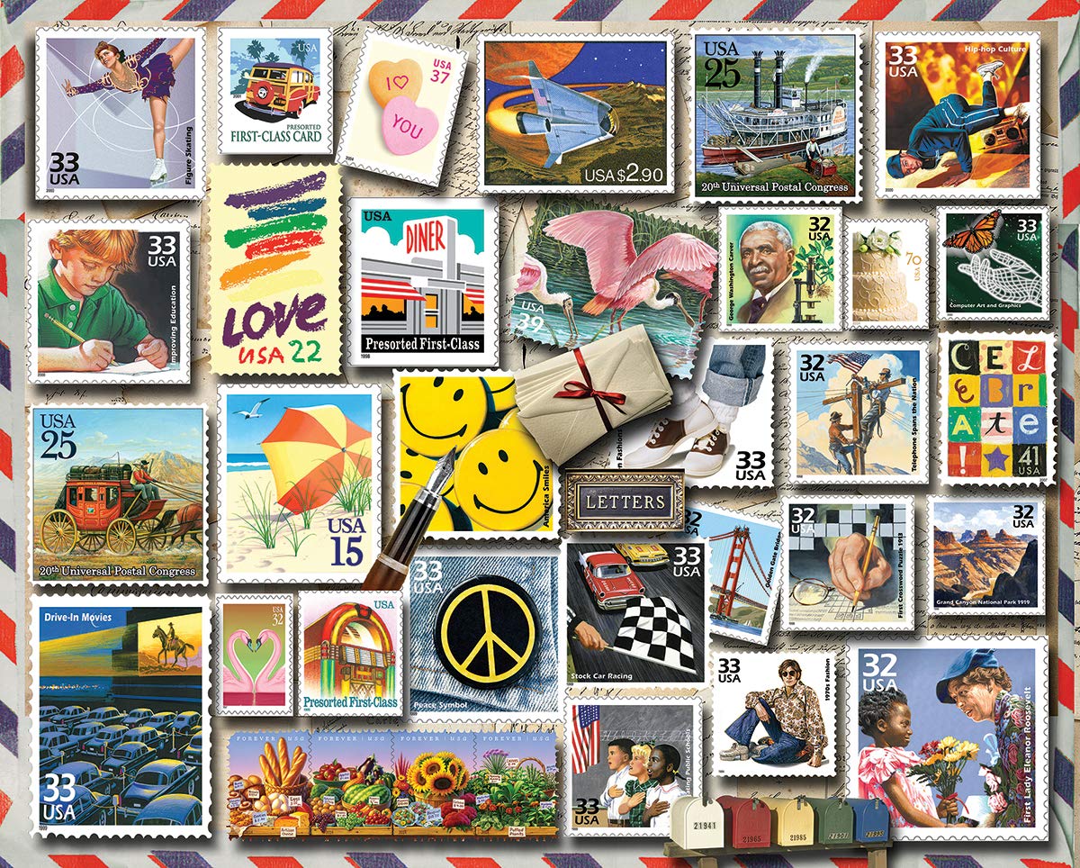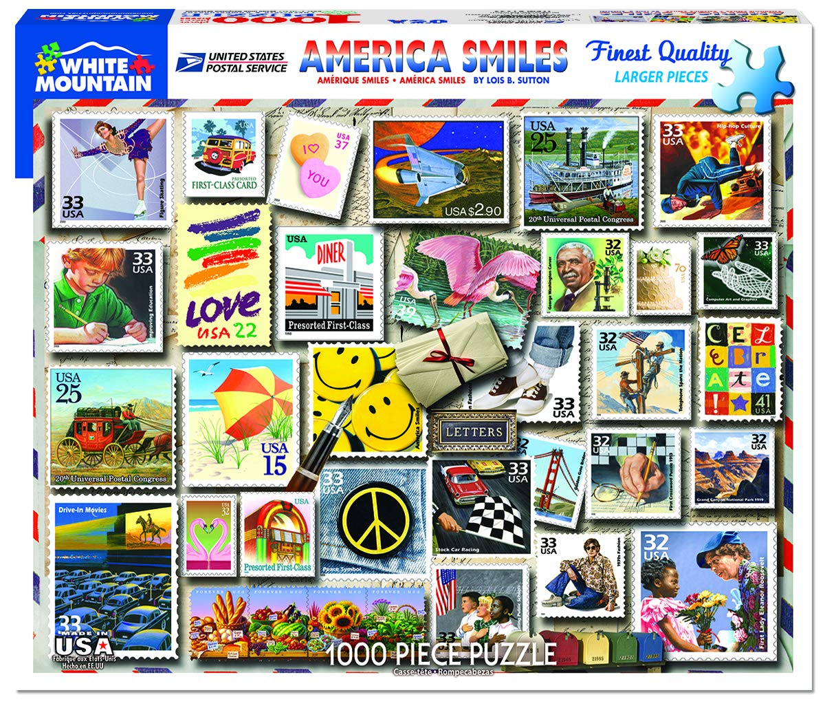 Here's a collection of American stamps that will bring a smile of remembrance. Trace our history from stagecoach, paddleboat and space travel to integration, peace, love, bobby sox and hip hop. This colorful compilation has been assembled by artist Lois B. Sutton for a 1000-piece puzzle. Bring home the fantastic America Smiles Jigsaw Puzzle; hours of fun and entertainment everyone will enjoy! Lois B. Sutton’s art jigsaw puzzles are full of detail, bright colors, and often vintage themed. Art jigsaw puzzles are a fun and inexpensive way to enjoy beautiful works of art firsthand. Jigsaw puzzles are also used to boost cognitive skills; develop hand-eye coordination, fine motor skills, problem solving, shape recognition, memory, and task completion. The White Mountain Puzzles - America Smiles includes 1,000 unique interlocking pieces made of sturdy blue chipboard on recycled paper. Extra large sized pieces for easy handling. Puzzle dimensions (completed): 24 x 30 inches. Every White Mountain Puzzle is proudly manufactured in America with a 100% customer satisfaction guarantee.
