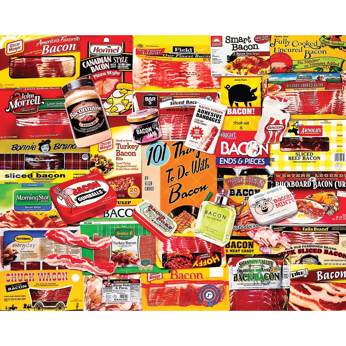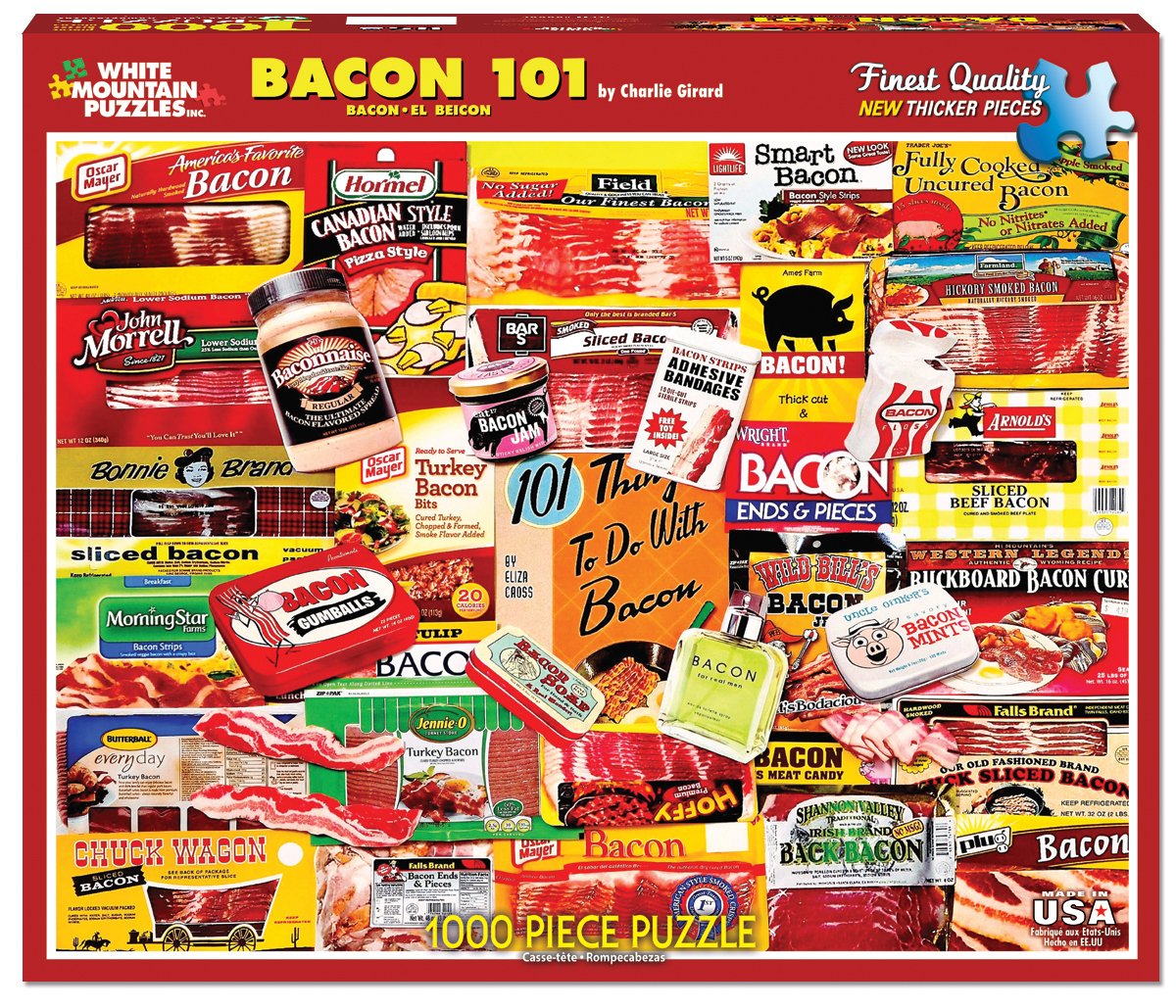 Centered on the popular cookbook by Eliza Cross titled 101 Things To Do With Bacon, this 1000-piece puzzle features a collage of bacon memories with the front page of her book as its focal point. Surrounding the vintage cookbook are various brands and types of bacon, as well as a few gags like bacon-scented perfume and bacon Band-Aids. Charlie Girard really gets the message across in each of this fun puzzle's 1,000 meaty pieces, and brings back some humorous memories. A great choice for all the bacon lovers out there, this brightly colored collage puzzle is as entertaining as it is challenging. Bring home the fantastic Bacon 101 Jigsaw Puzzle; hours of fun and entertainment everyone will enjoy! Art jigsaw puzzles are a fun and inexpensive way to enjoy beautiful works of art first hand! Jigsaw puzzles are also used to boost cognitive skills; develop hand-eye coordination, fine motor skills, problem solving, shape recognition, memory, and task completion. The White Mountain Puzzles - Bacon 101 includes 1,000 unique interlocking pieces made of sturdy blue chipboard on recycled paper. Extra large sized pieces for easy handling. Puzzle dimensions (completed): 24 x 30 inches. Every White Mountain Puzzle is proudly manufactured in America with a 100% customer satisfaction guarantee.