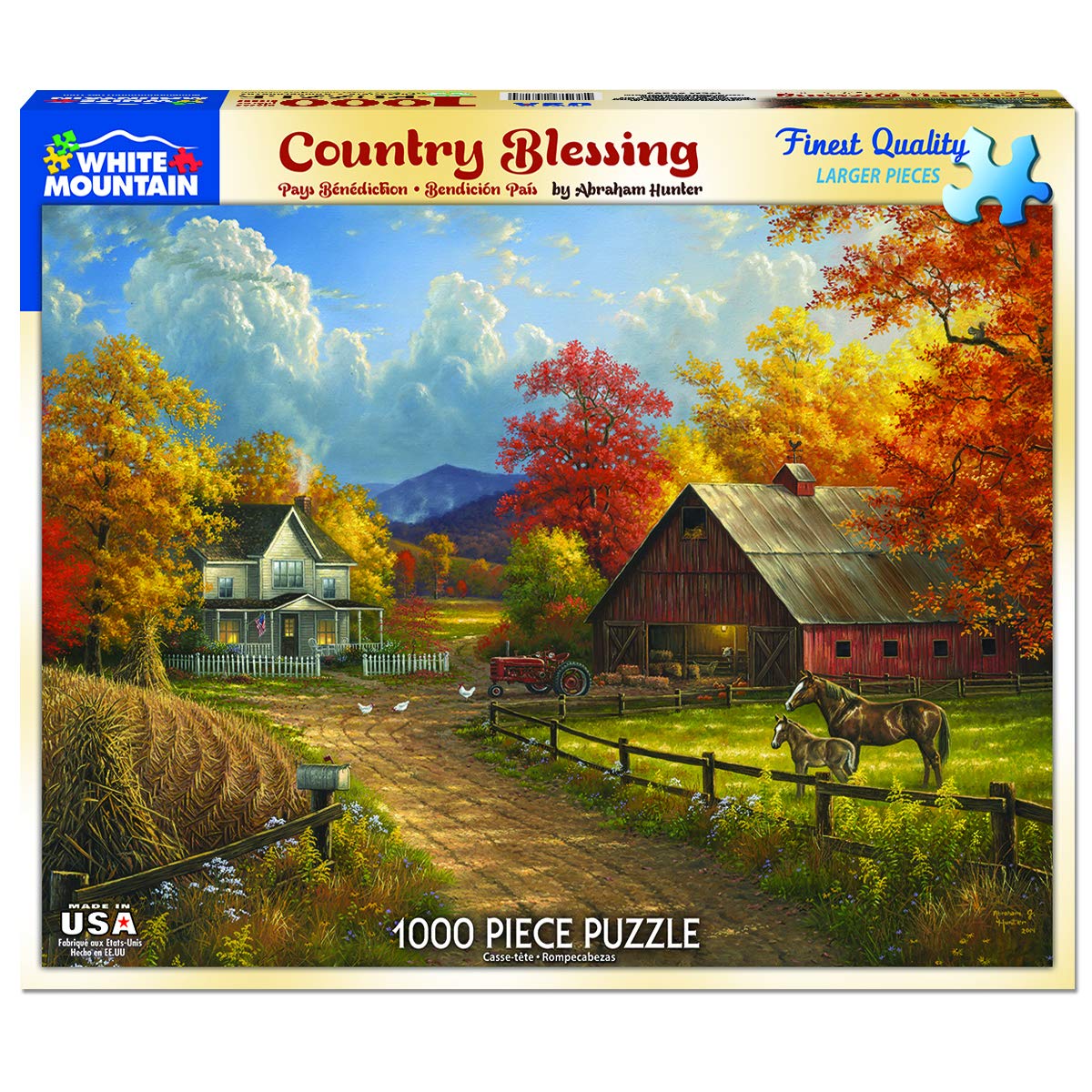 Storm clouds gather over an otherwise bucolic farm scene. Lights glow in the farmhouse and chickens Peck away in the yard next to the farmer's tractor. Nearby, a mare and Foal wait to be LED to the safety and comfort of the barn, to keep Company with the cow and calf already in residence. Thrill the entire family by bringing home the country blessing jigsaw puzzle; 1000 pieces of fun and entertainment everyone can enjoy! This stunning piece is the work of Abraham hunter. The self-taught young artist Abraham hunter enjoys nature and all it has to offer. He enjoys painting a broad variety of subjects in both oil and acrylic mediums and in impressionistic or Photorealistic styles. He often portrays somewhat “utopia” like scenes. Art jigsaw puzzles are a fun and inexpensive way to enjoy beautiful works of art first hand! Jigsaw puzzles are also used to boost cognitive skills, develop hand-eye coordination, fine motor skills, problem solving, shape recognition, memory, and task completion. The White Mountain Puzzles - Country blessing includes 1000 unique interlocking pieces made of sturdy blue chipboard on recycled paper. Extra large sized pieces for easy handling. Completed puzzle dimensions: 24 x 30 inches. Every white Mountain puzzle is proudly manufactured in America with a 100.