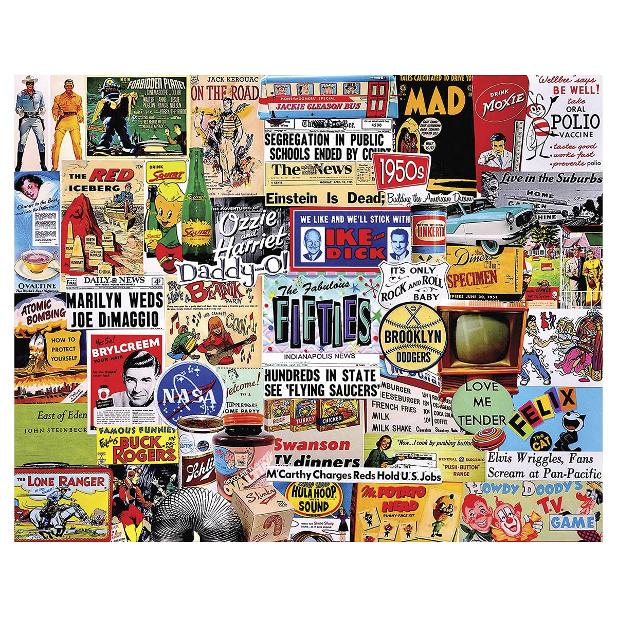 The 50S is a time when Marilyn married Joe DiMaggio, Brylcreem styled your hair, buck Rogers & the lone Ranger saved The day, and we were entertained by Ozzie & Harriet, Mad magazine, Howdy Doody, and the one and only Elvis. We could read on the road or east of Eden while eating a TV dinner washed down with Ovaltine or maybe a Schlitz, followed by a workout in a hula hoop. Charlie Girard captures this decade in White Mountain puzzles' Fabulous 50S with his seemingly endless supply of ideas and creativity. Charlie has become one of White Mountain puzzles’ most popular puzzle designers and the creator of fantastic and unique collage puzzles. Art jigsaw puzzles are a fun and inexpensive way to enjoy beautiful works of art firsthand. Jigsaw puzzles are also used to boost cognitive skills and to develop hand-eye coordination, fine motor skills, problem-solving, shape recognition, memory, and task completion. The fabulous 50S puzzle includes 1, 000 unique interlocking pieces made of sturdy blue chipboard on recycled paper. Extra large sized pieces for easy handling. Puzzle dimensions (completed): 24 x 30 inches. Every White Mountain puzzle is proudly manufactured in America with a 100% customer satisfaction.