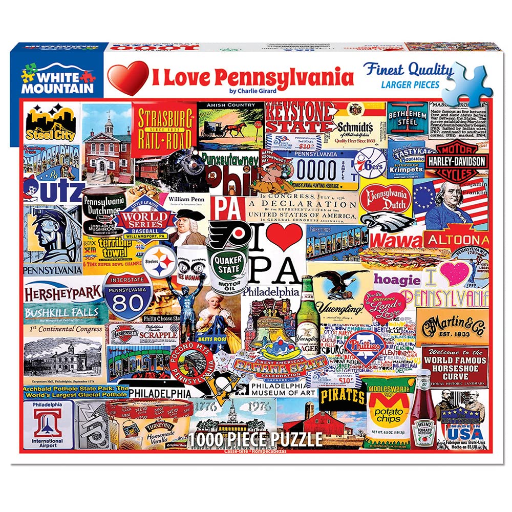 Take a ride on the Strasburg Railroad or go for a spin through Amish Country on a Harley Davidson assembled in PA. Visit Gettysburg, Hershey, Punxsutawney, and of course Philly where the Declaration of Independence was signed and the Liberty Bell was cracked. Cheer on your favorite teams, be they Phillies, Pirates, 76ers, Eagles, Steelers, Flyers, Penguins or Union. Chow on some scrapple or a hoagie with a side of Utz chips, paired with a Yuengling. Lots to do in the Commonwealth of Pennsylvania, as shown in this collage by Charlie Girard. 1,000 piece puzzle with a finished size of 24” x 30”.