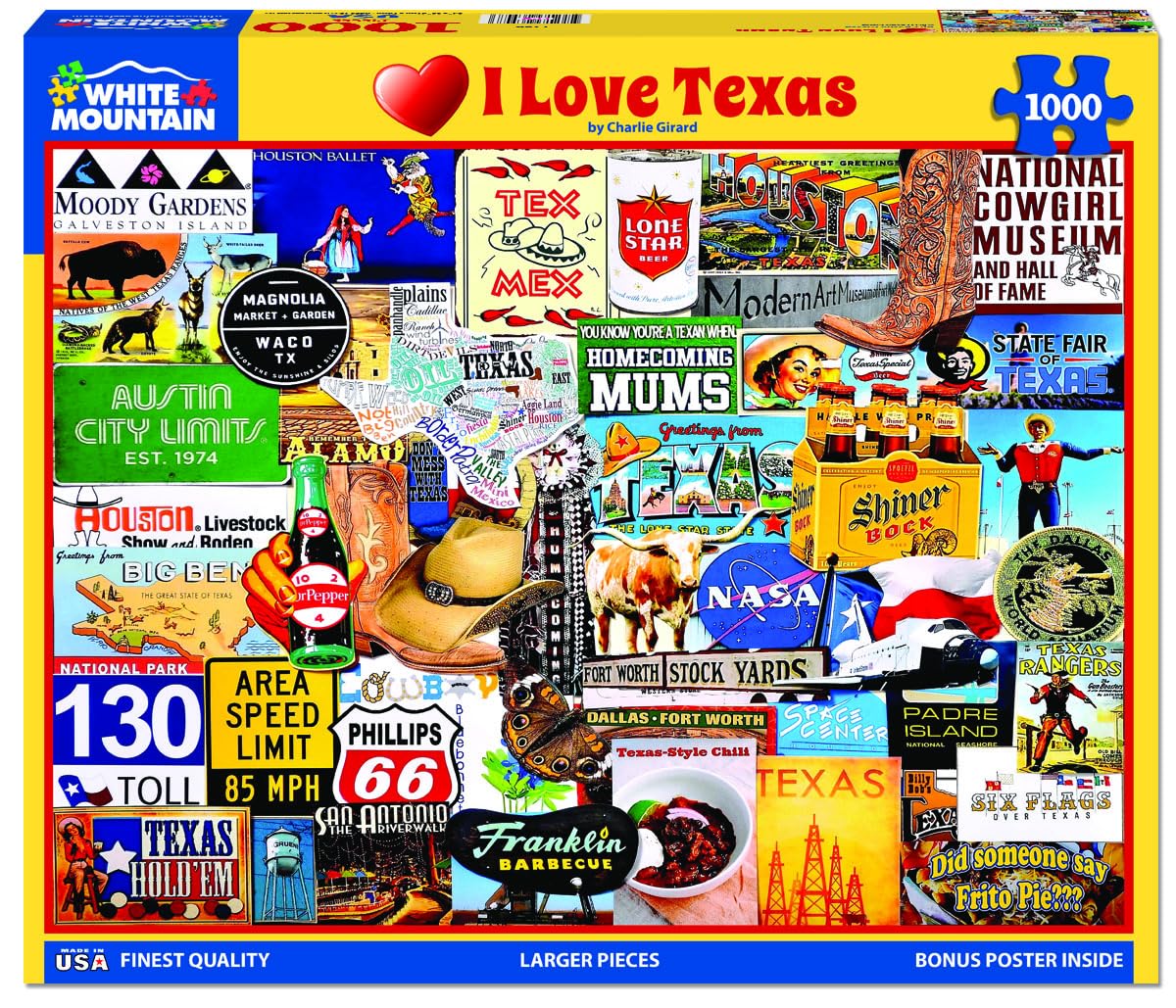 Remember the Alamo, but don't forget the Texas Rangers, lone Star beer, Dallas cowboys, the San Antonio River walk, the National cowgirl Hall of Fame, padre and Galveston islands, NASA, Texas hold ‘em, oil wells, big hats, big money, enormous cattle ranches, rodeo ridin’, steer Robin’ and so much more. The term “six flags over Texas” refers to the several nations that have ruled the territory in the past, including Spain, France, and Mexico, while the name Texas comes from the Caddo Indian word Tejas, meaning friends. Our second largest state has a rich and colorful history. Thrill the entire family with hours upon hours of entertainment. Jigsaw puzzles are also used to boost cognitive skills; develop hand-eye coordination, fine motor skills, problem solving, shape recognition, memory, and task completion. The White Mountain puzzles -I love Texas includes 1000 unique interlocking pieces made of sturdy blue chipboard on recycled paper. Extra large sized pieces for easy handling. Completed puzzle dimensions: 24 x 30 inches. Every White Mountain puzzle is proudly manufactured in America with a 100% customer satisfaction.